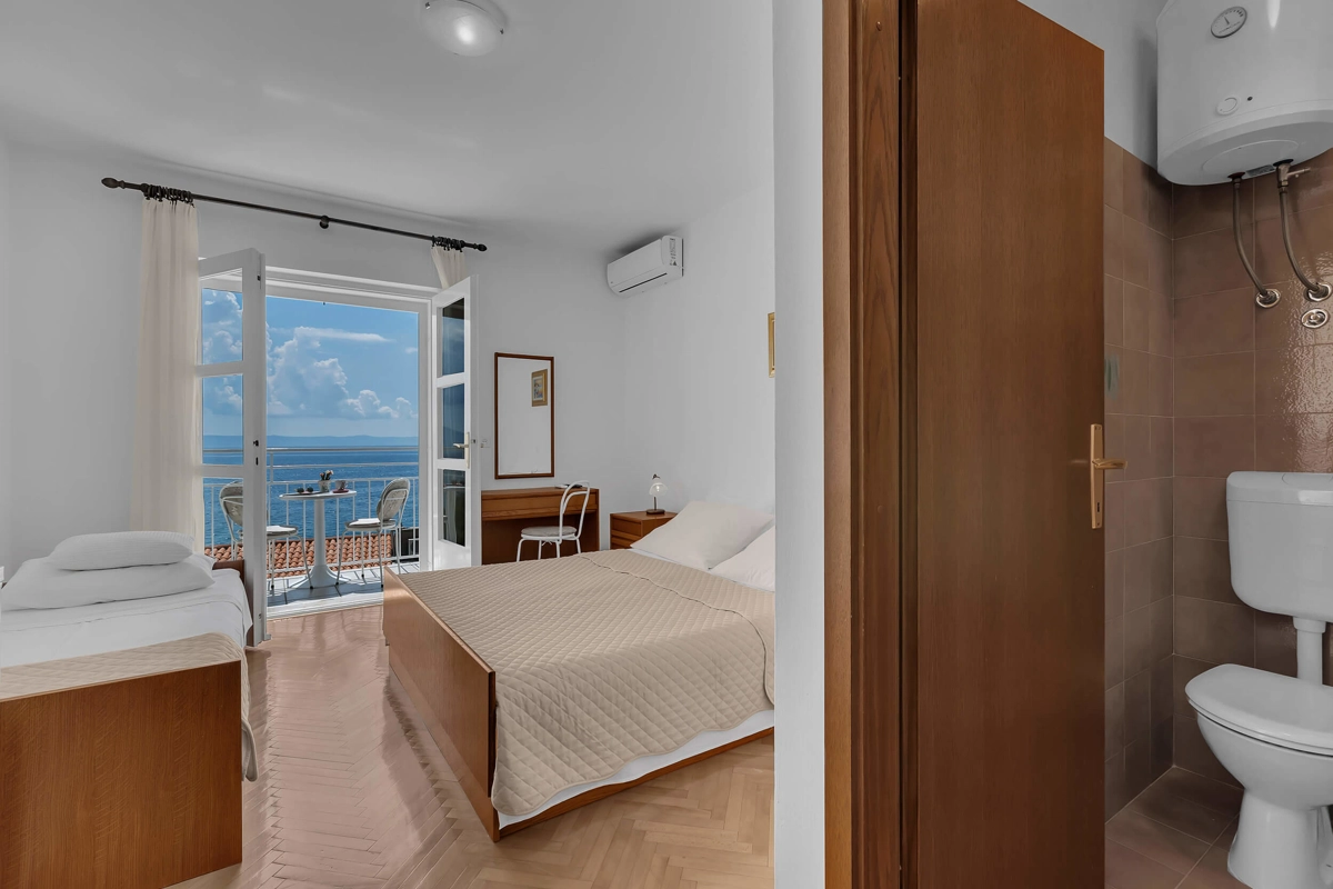 Beachfront rooms Ana A2 has capacity for 3 persons. It has a queen-sized bed and a single bed, a bathroom and an amazing view of the sea from the balcony.
