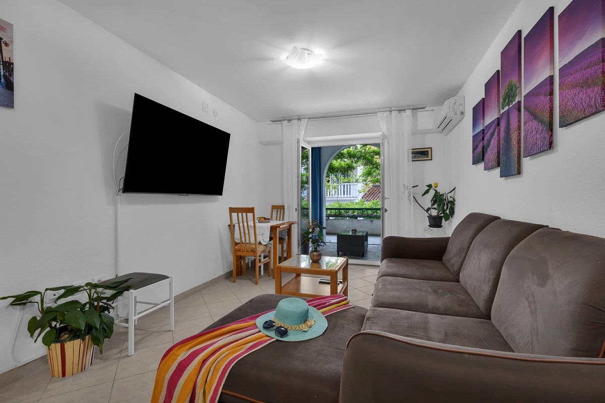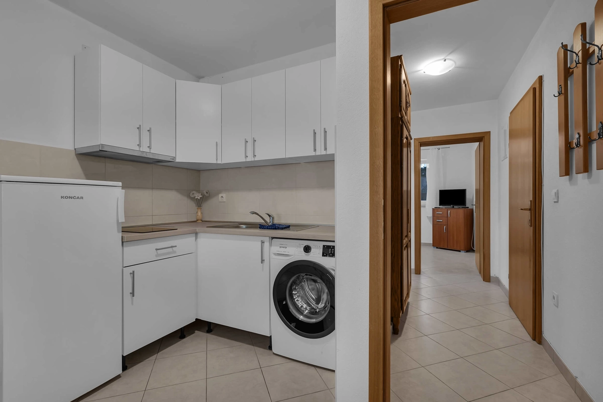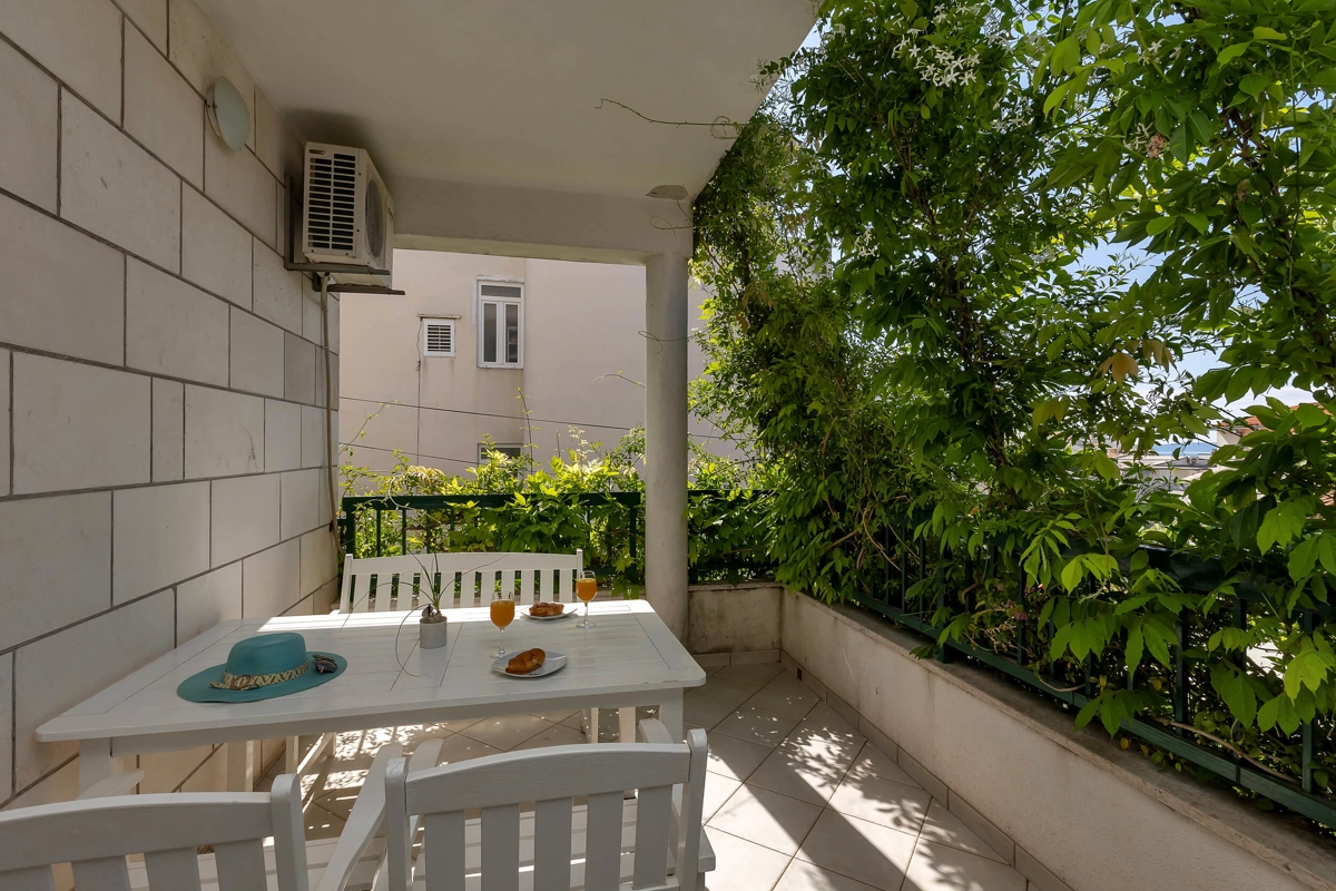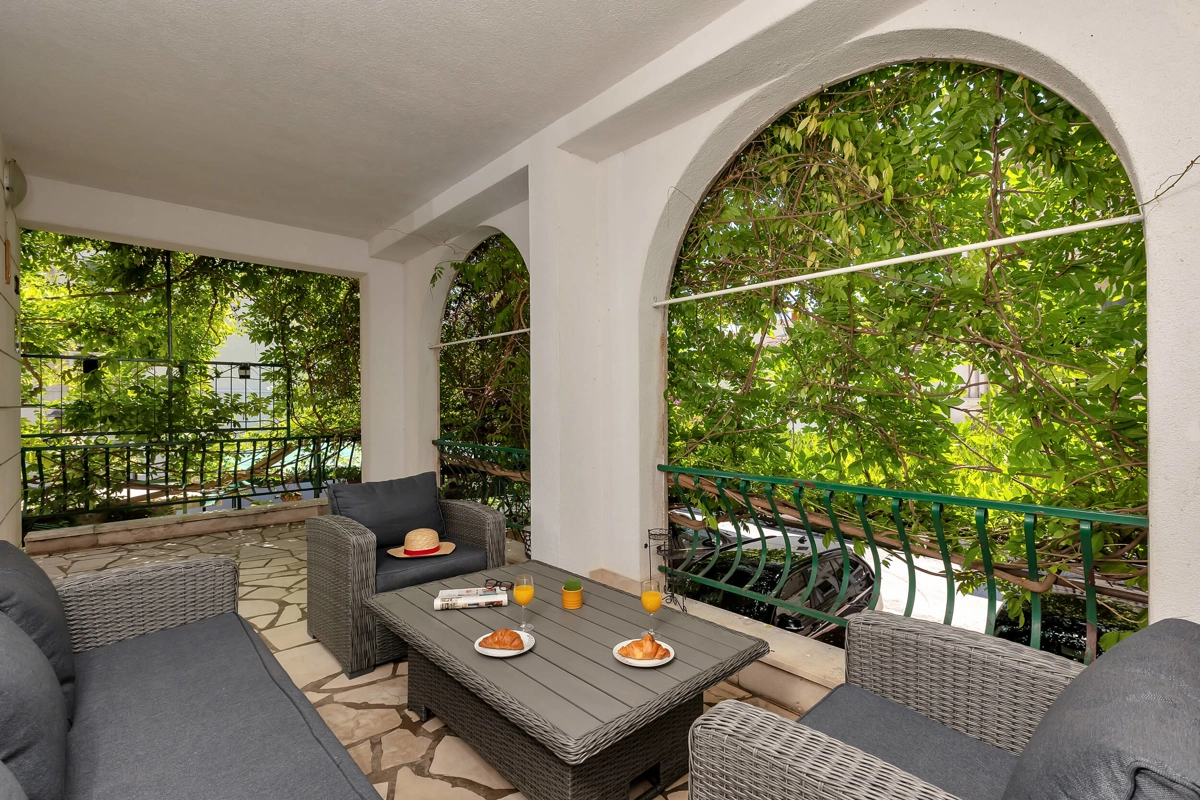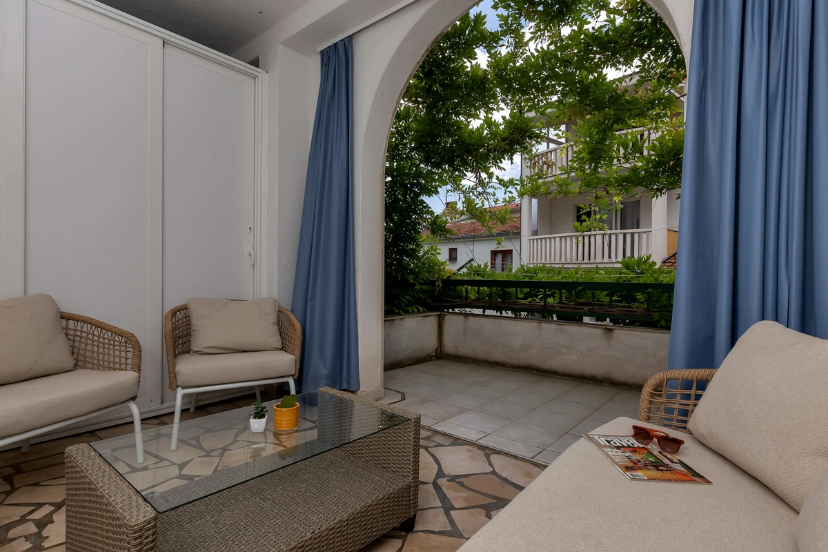 Apartment A5 is an apartment for maximum of 4 persons, situated on the ground floor. It has two bedrooms with one queen-sized bed and two one-person beds. The kitchen is equipped with a dish-washer, fridge with a freezer and a microwave. It has a washing machine, a flat-screen TV and a terrace enshrined in greenery. Apartment is air-conditioned, has a free parking and wi-fi. Bed linen and towels are provided in the apartment.