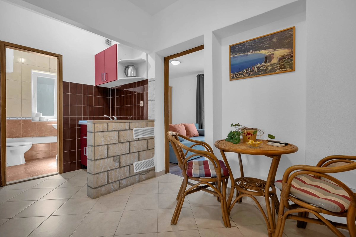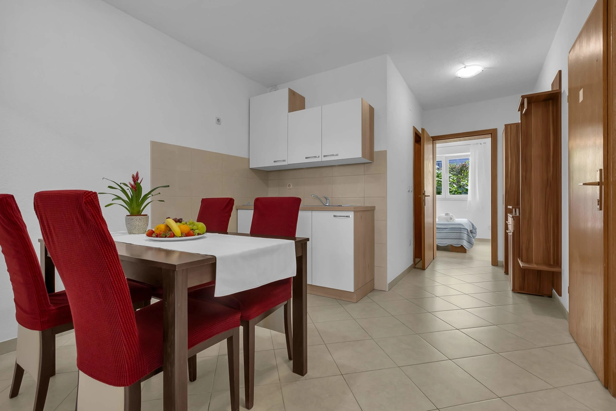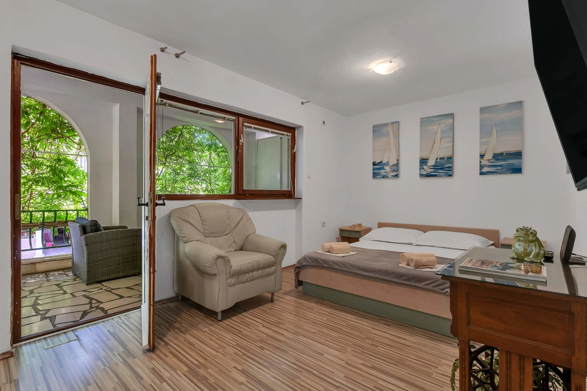 Apartment A3 is a studio apartment for 2 persons, situated on the 2nd floor. It has one queen-sized bed and a mini-kitchen with a dining area. With a terrace surrounded with greenery it is a perfect summer oasis for two. Apartment is air-conditioned, has a free parking and wi-fi. Bed linen and towels are provided in the apartment.