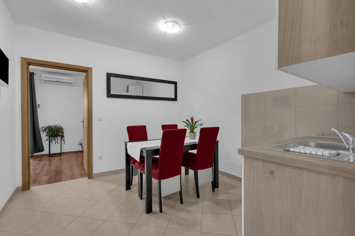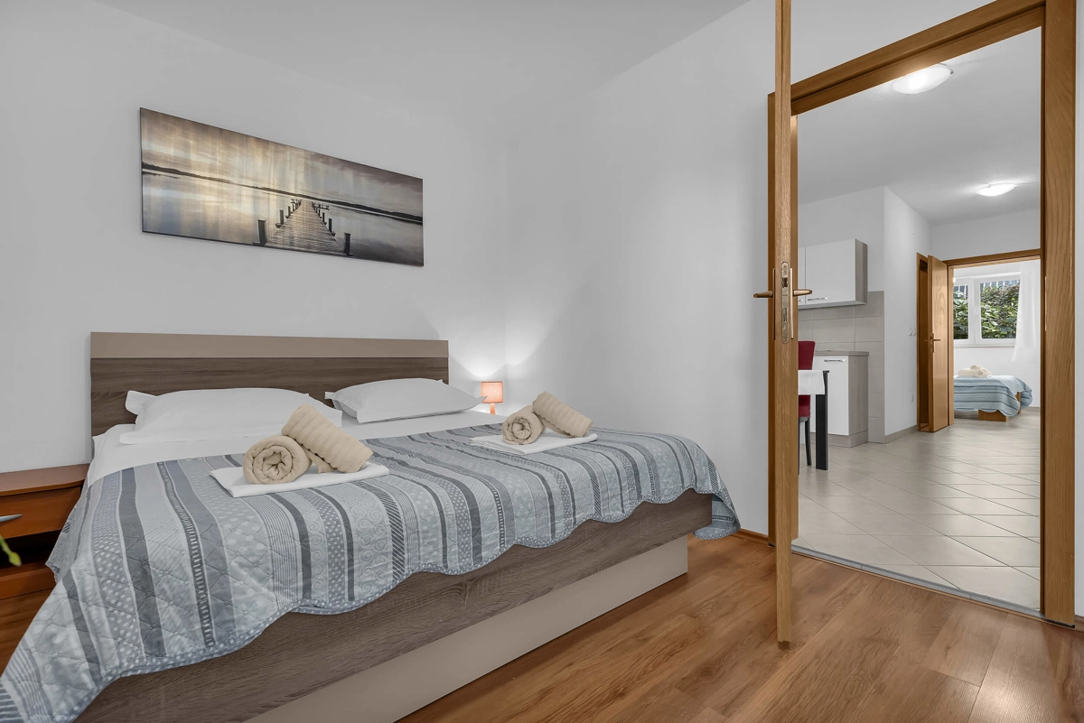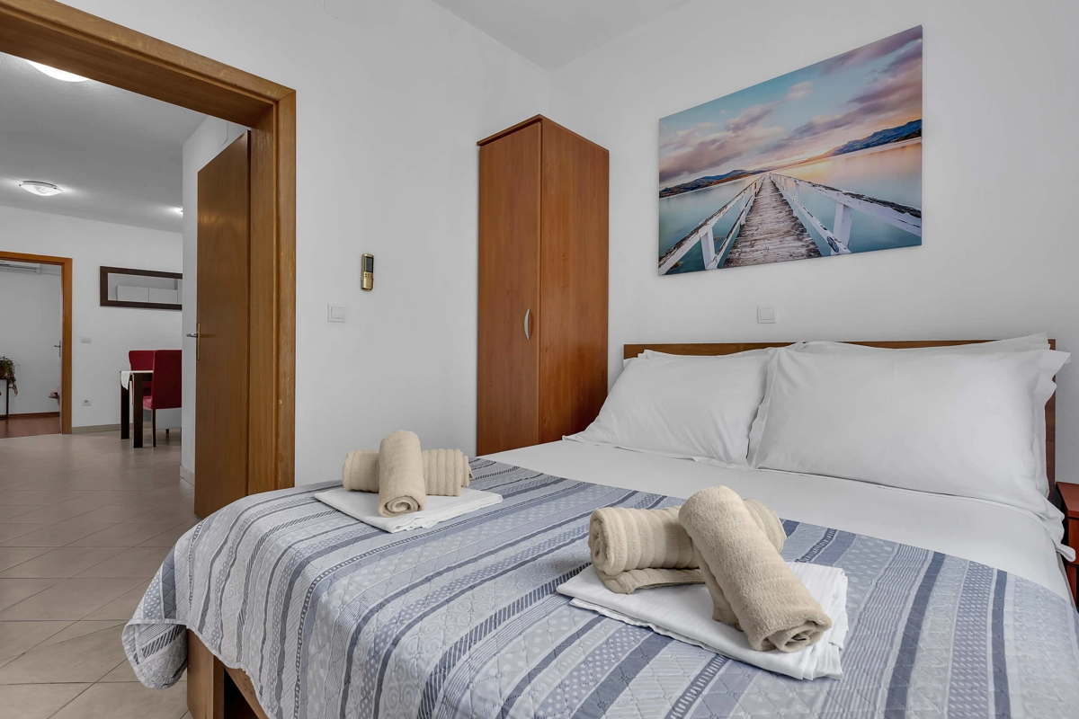 Apartment A2 is a two-bedroom apartment for 4 persons, with a flat-screen TV, and a dining area with a dining table. Each bedroom has a queen-sized bed. Apartment is air-conditioned, has a free parking and wi-fi. Bed linen and towels are provided in the apartment.