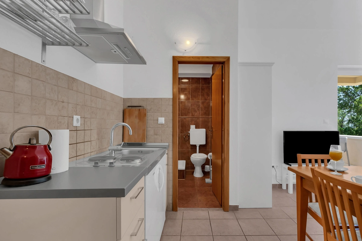 Apartment A3 has capacity for 4 persons and is situated on the 2nd floor. The apartment is air-conditioned, has 2 bedrooms, one with flat-screen TV, 1 bathroom, a dining area with a table, mini-kitchen, a terrace and a balcony with a seating area for cozy relaxing evenings. The bedrooms have queen-sized beds. Apartment is air-conditioned, has a free parking and wi-fi. Bed linen and towels are provided in the apartment.