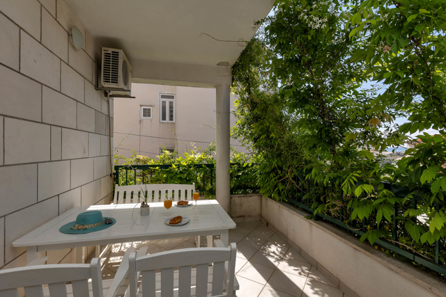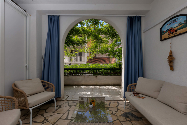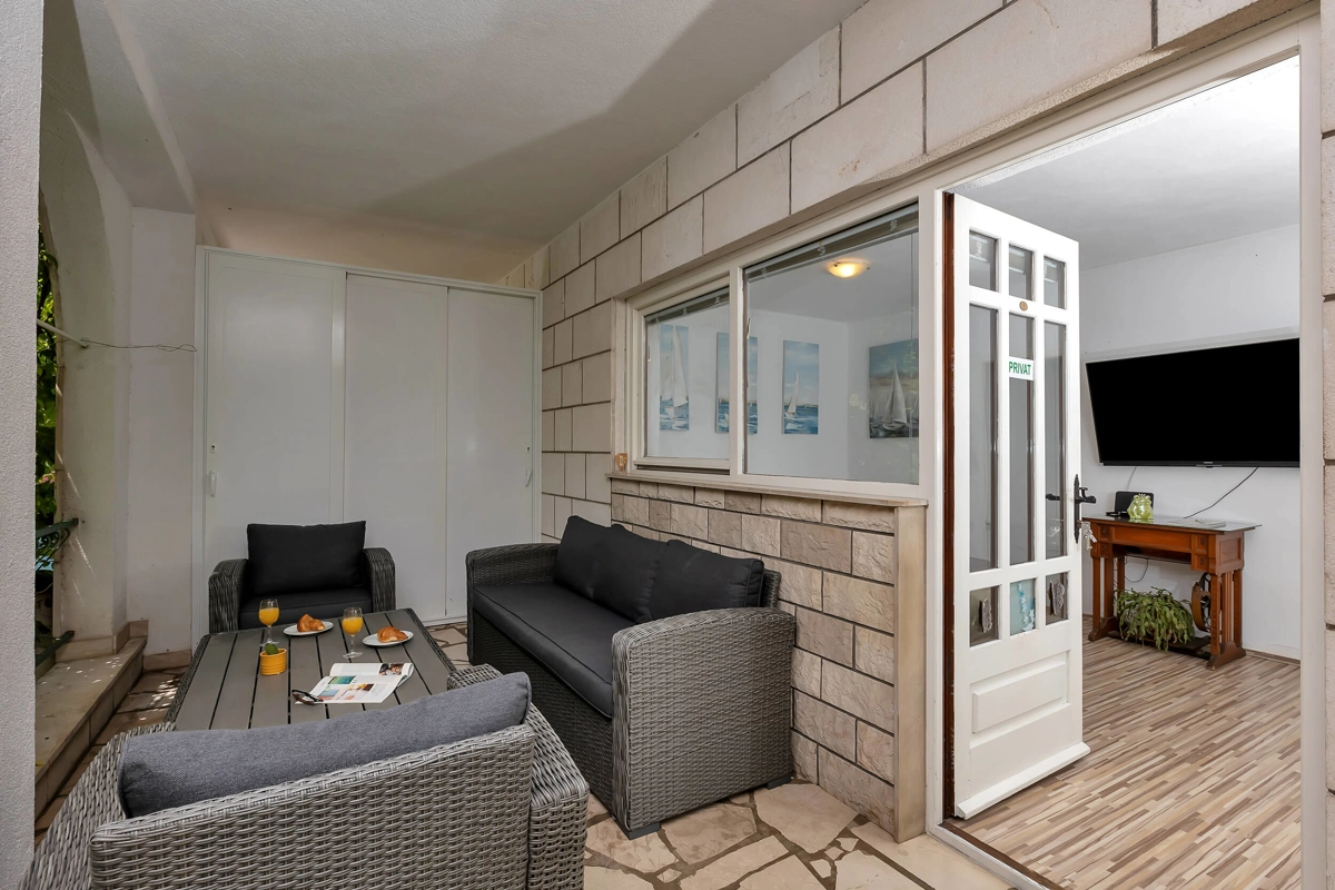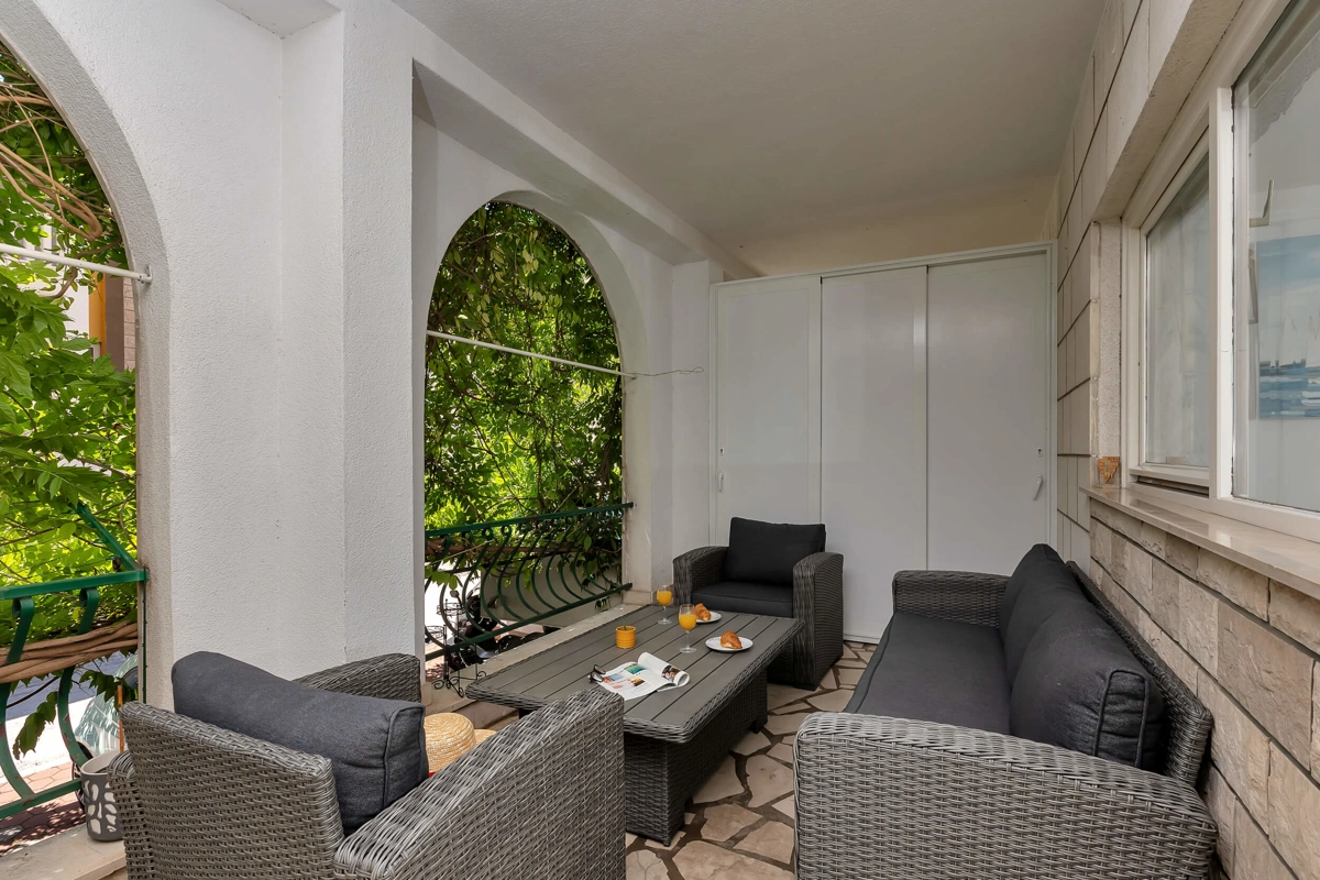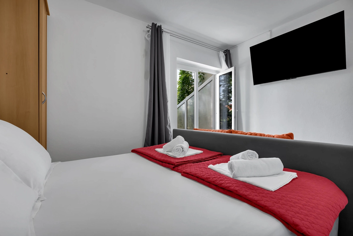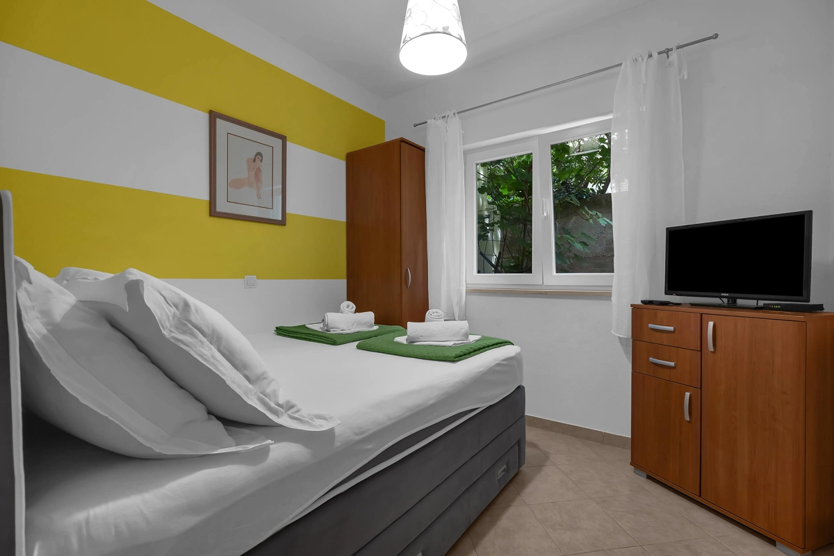Apartment A5 is an apartment for maximum of 4 persons, situated on the ground floor. It has two bedrooms with one queen-sized bed and two one-person beds. The kitchen is equipped with a dish-washer, fridge with a freezer and a microwave. It has a washing machine, a flat-screen TV and a terrace enshrined in greenery. Apartment is air-conditioned, has a free parking and wi-fi. Bed linen and towels are provided in the apartment.