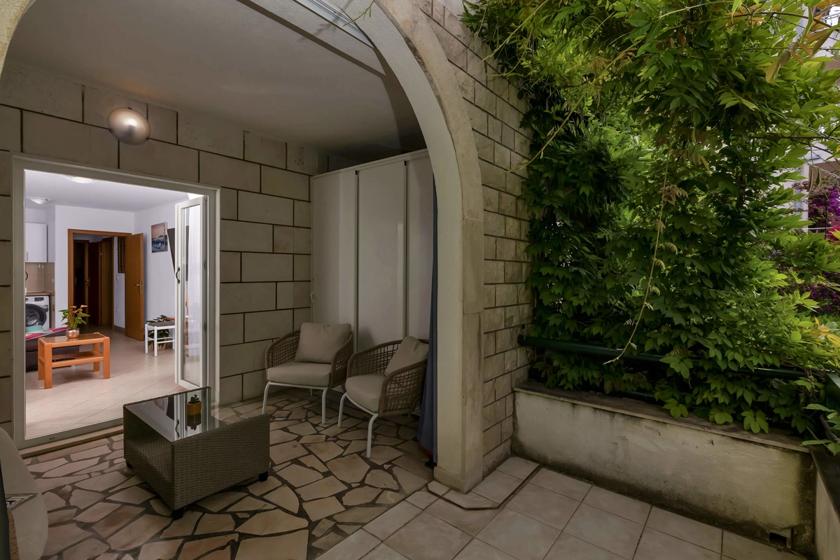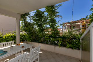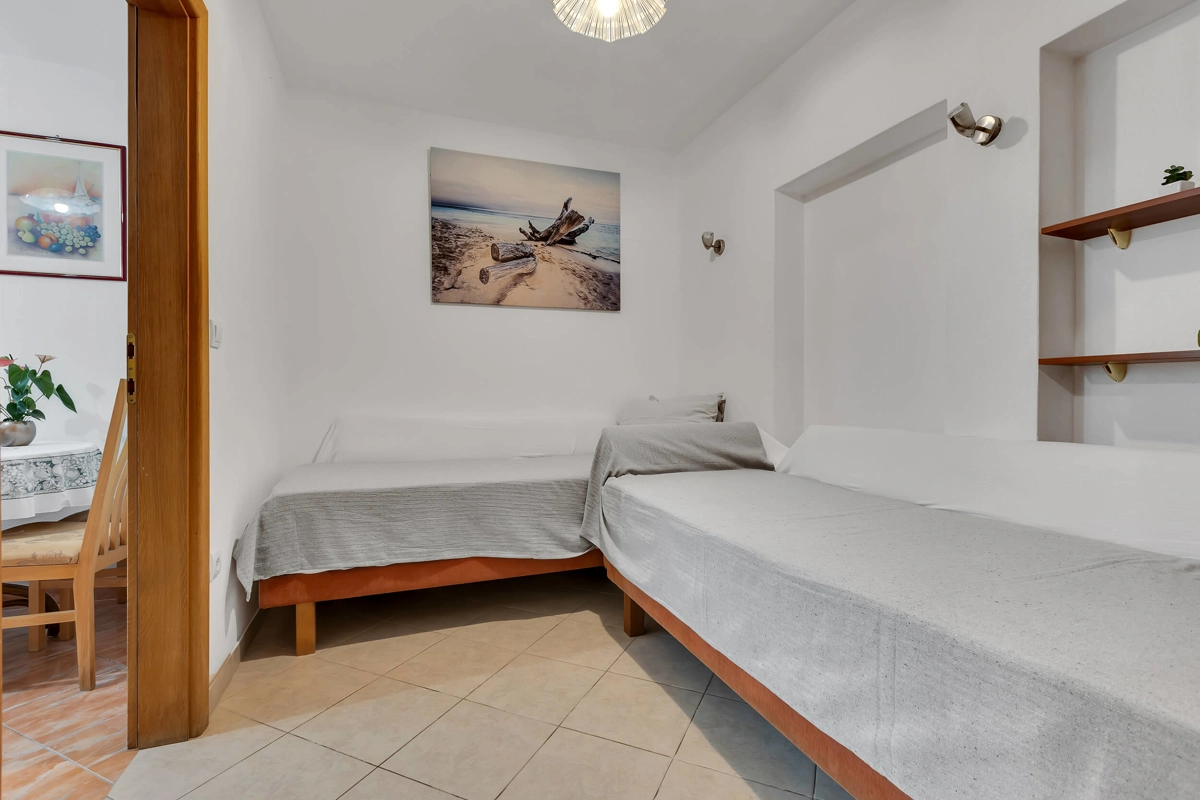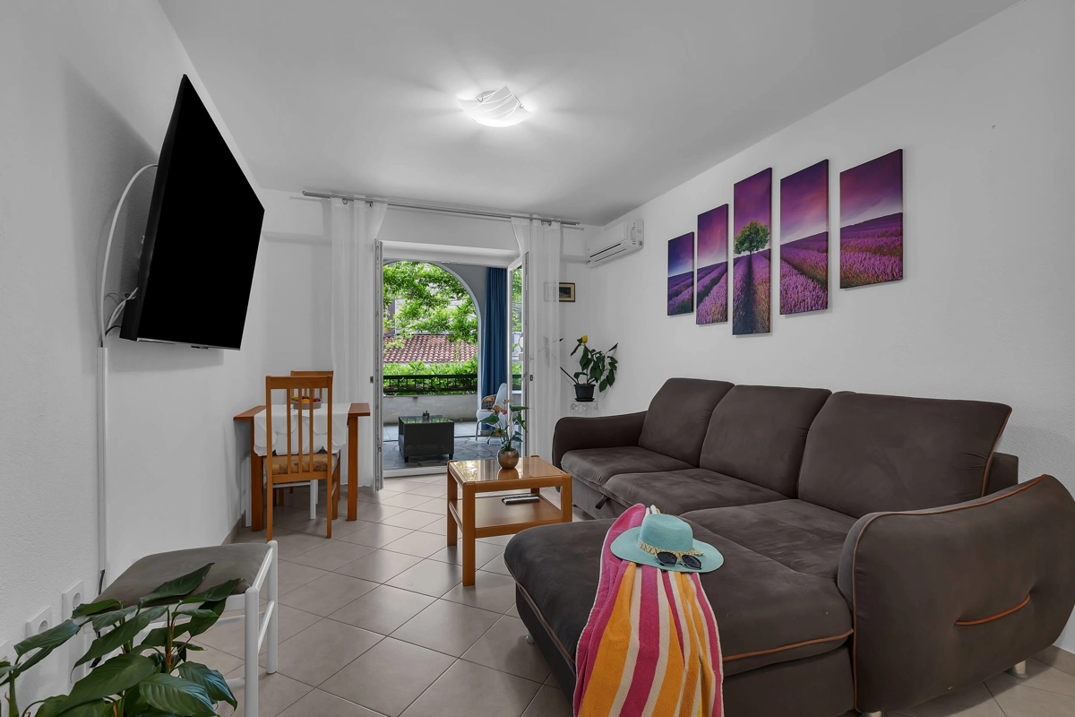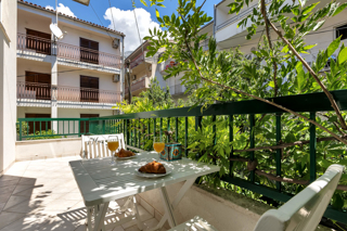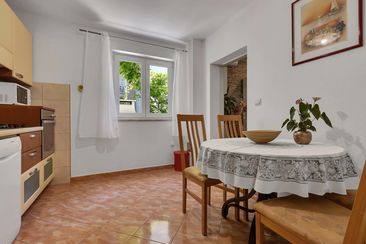Apartment A5 is an apartment for maximum of 4 persons, situated on the ground floor. It has two bedrooms with one queen-sized bed and two one-person beds. The kitchen is equipped with a dish-washer, fridge with a freezer and a microwave. It has a washing machine, a flat-screen TV and a terrace enshrined in greenery. Apartment is air-conditioned, has a free parking and wi-fi. Bed linen and towels are provided in the apartment.