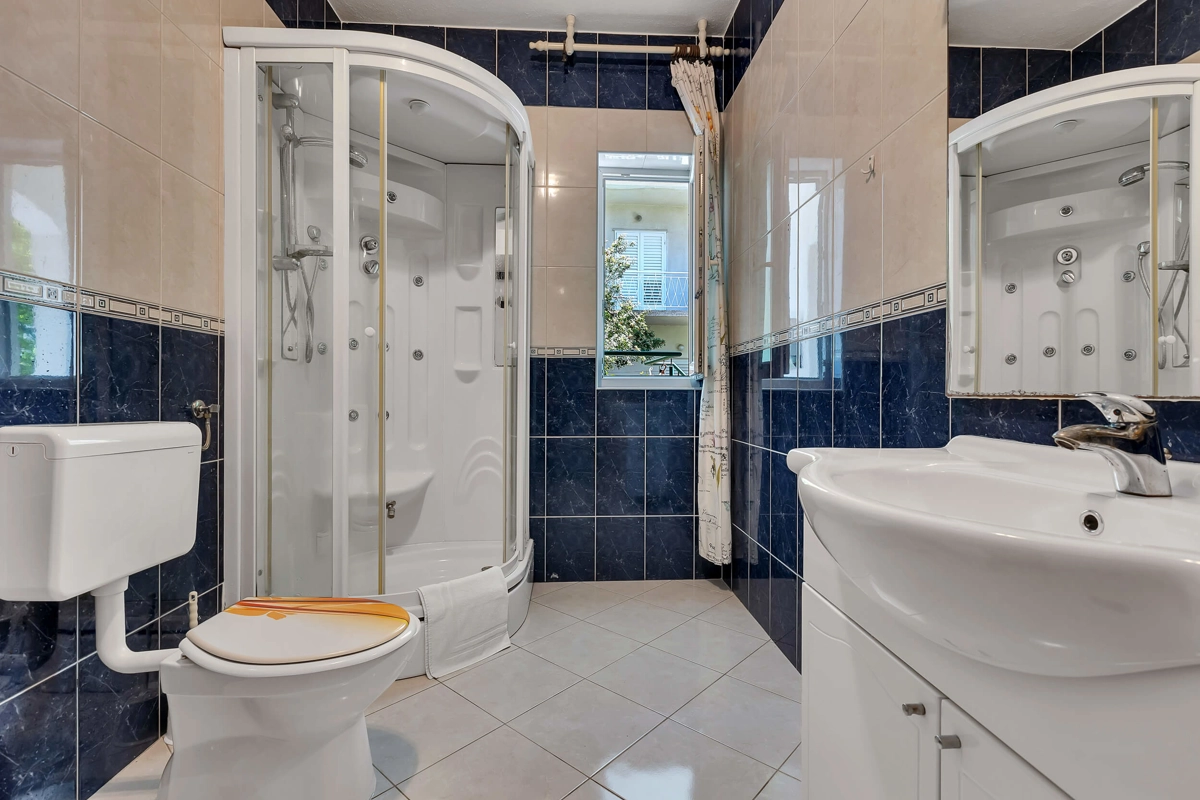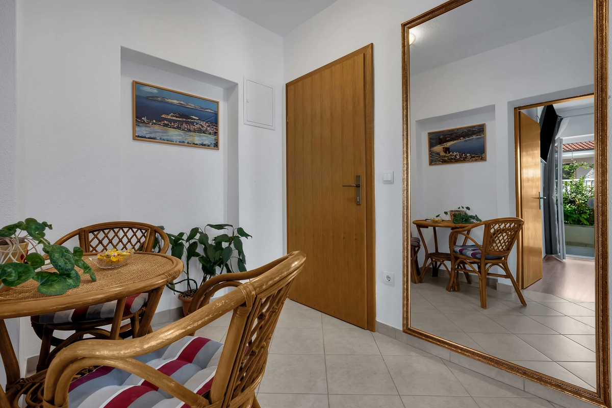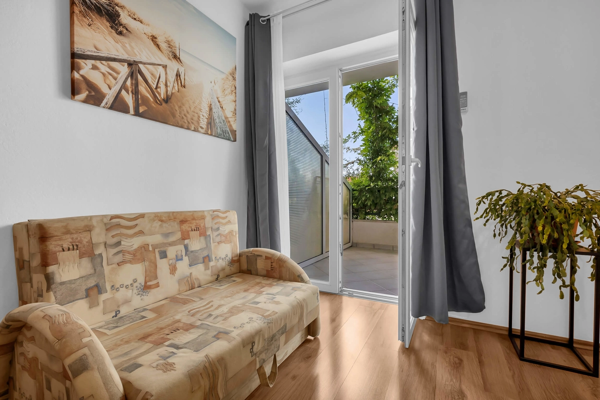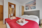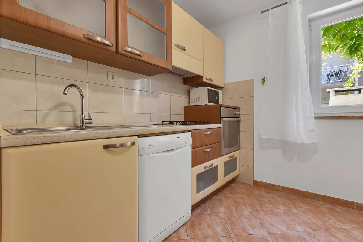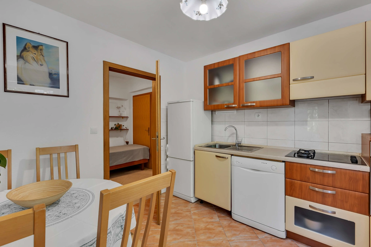 Apartment A5 is an apartment for maximum of 4 persons, situated on the ground floor. It has two bedrooms with one queen-sized bed and two one-person beds. The kitchen is equipped with a dish-washer, fridge with a freezer and a microwave. It has a washing machine, a flat-screen TV and a terrace enshrined in greenery. Apartment is air-conditioned, has a free parking and wi-fi. Bed linen and towels are provided in the apartment.