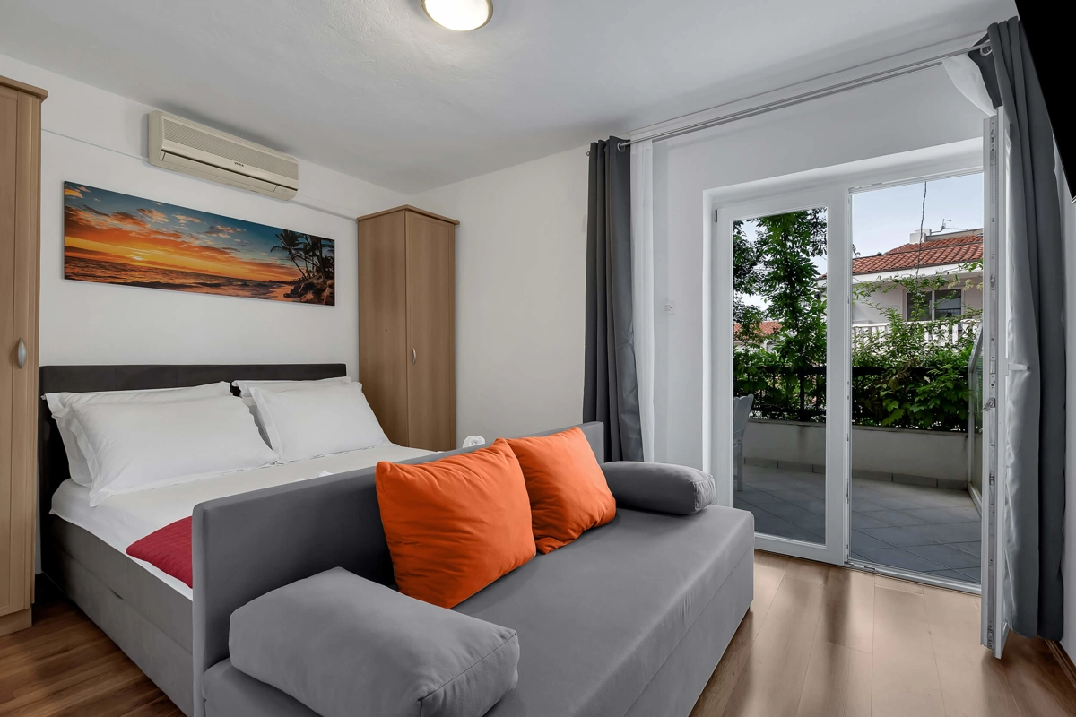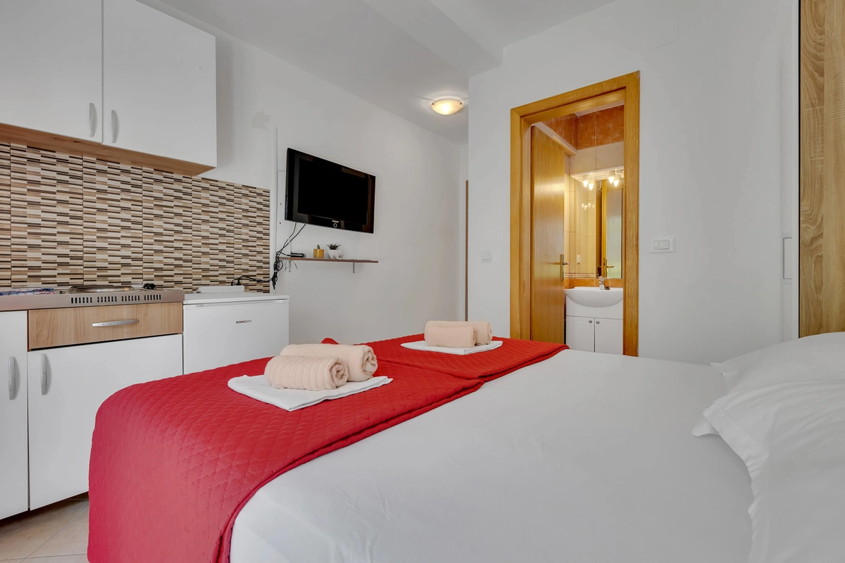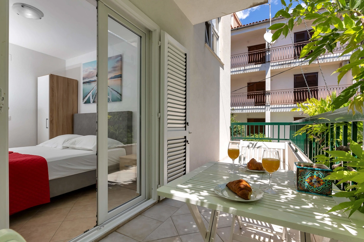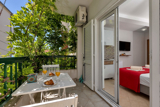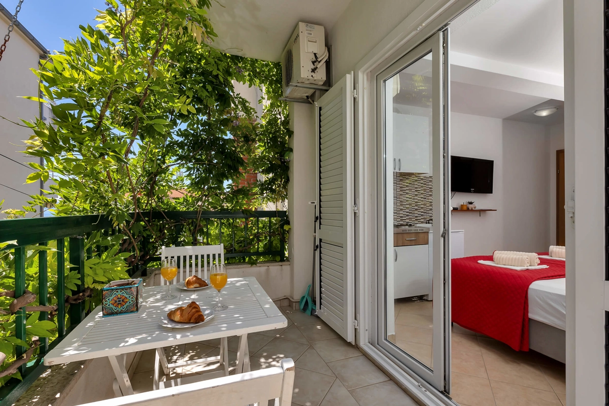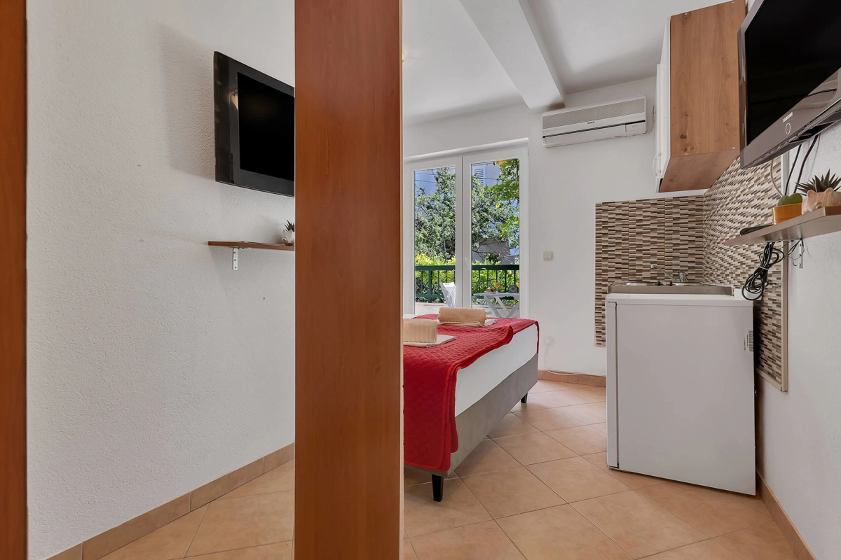 Apartment A1 is a studio apartment for 2 persons, situated on 1st floor. It has one queen-sized bed. With a balcony surrounded with greenery and a mini-kitchen, it is a perfect summer oasis for two. Apartment is air-conditioned, has a free parking and wi-fi. Bed linen and towels are provided in the apartment.