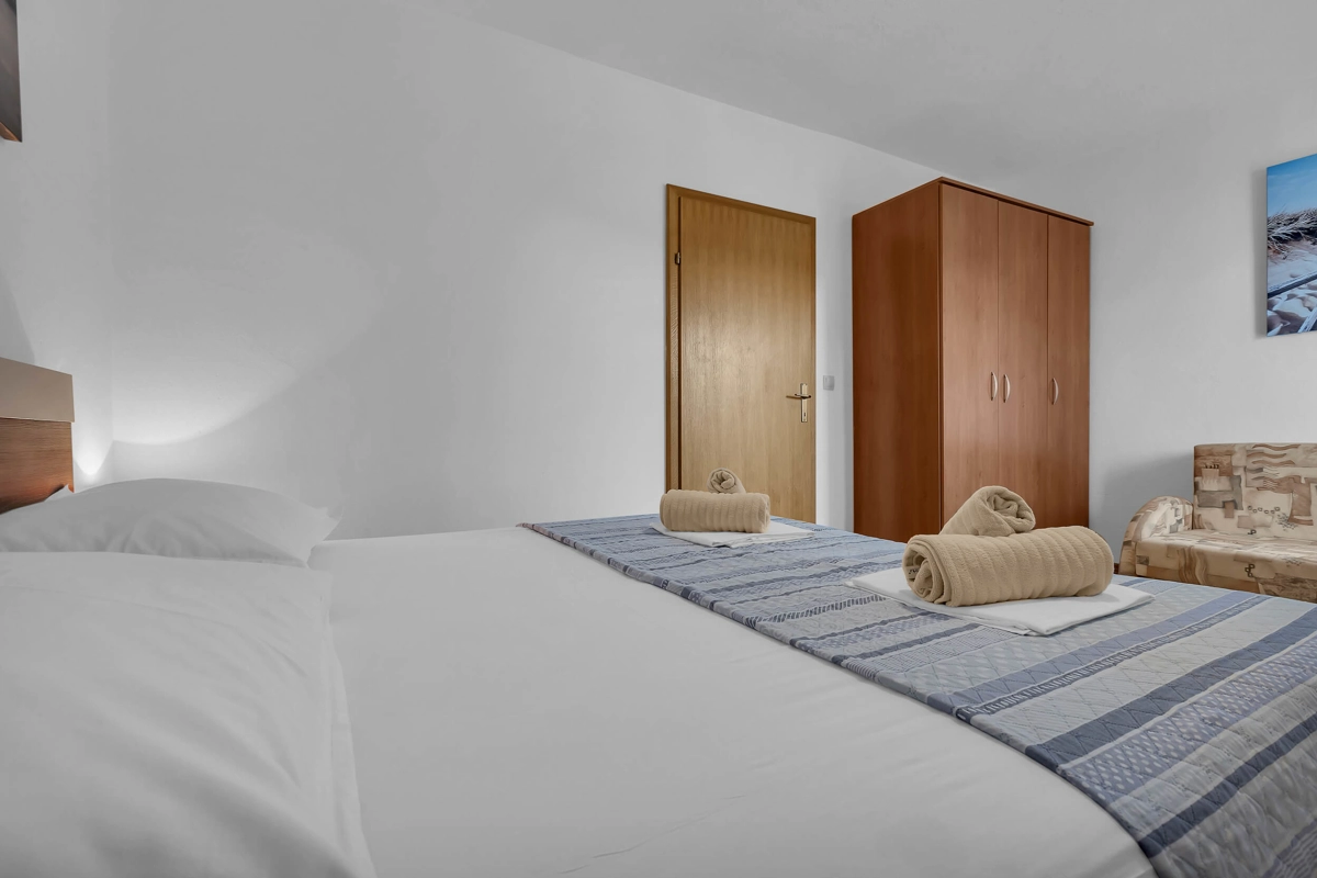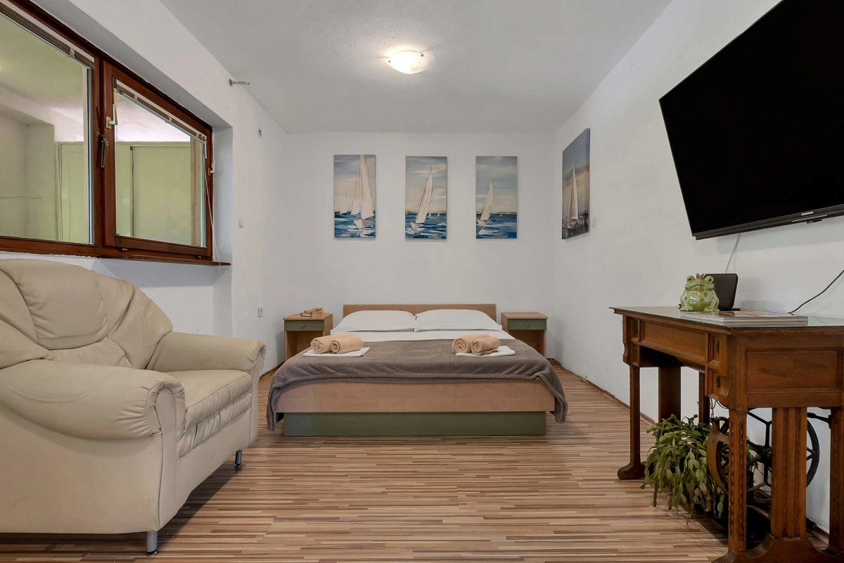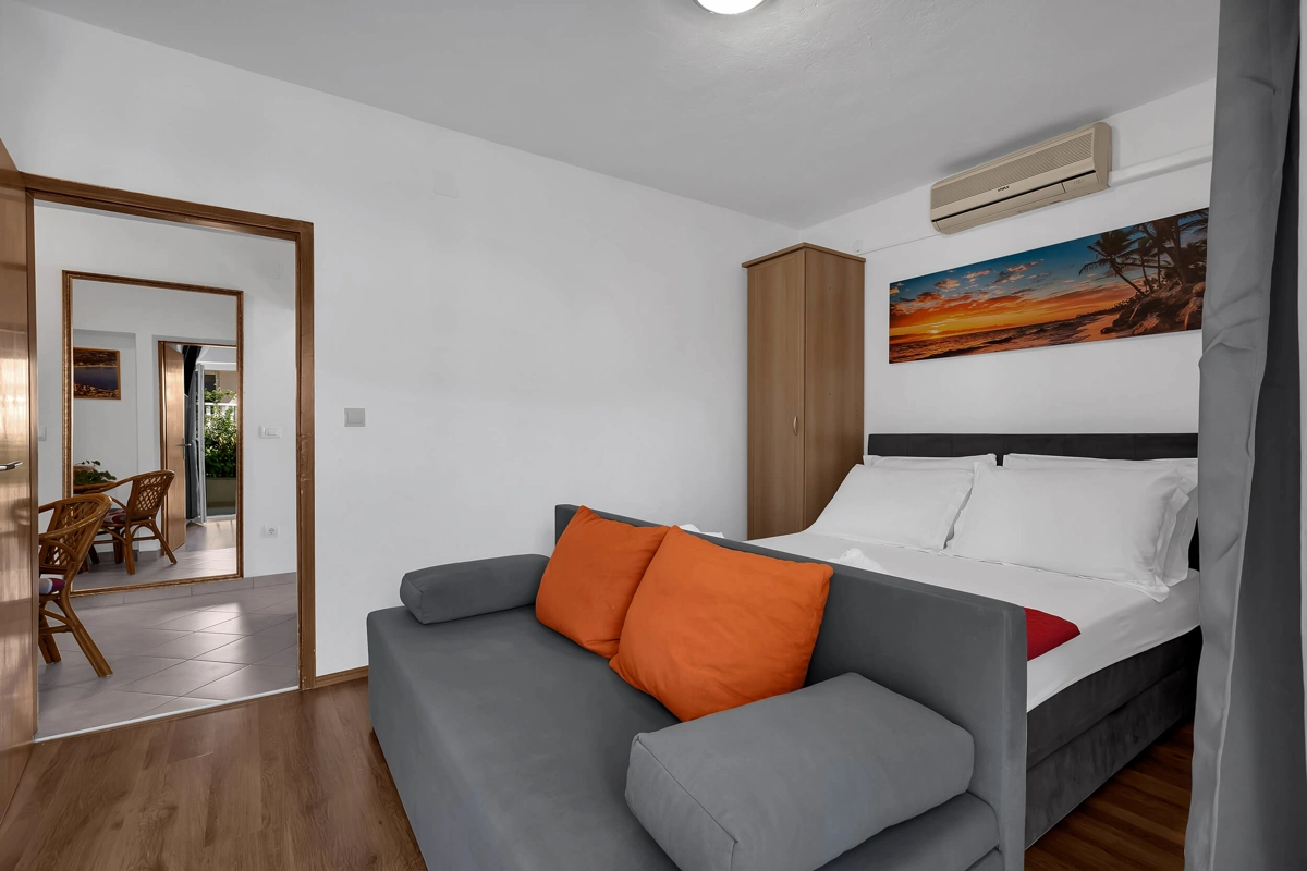 Apartment A4 is an apartment for maximum of 4 persons, situated on the ground floor. It has one queen-sized bed and a couch. It has a washing machine, a flat-screen TV and a terrace. Apartment is air-conditioned, has a free parking and wi-fi. Bed linen and towels are provided in the apartment.