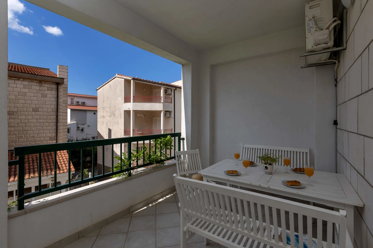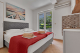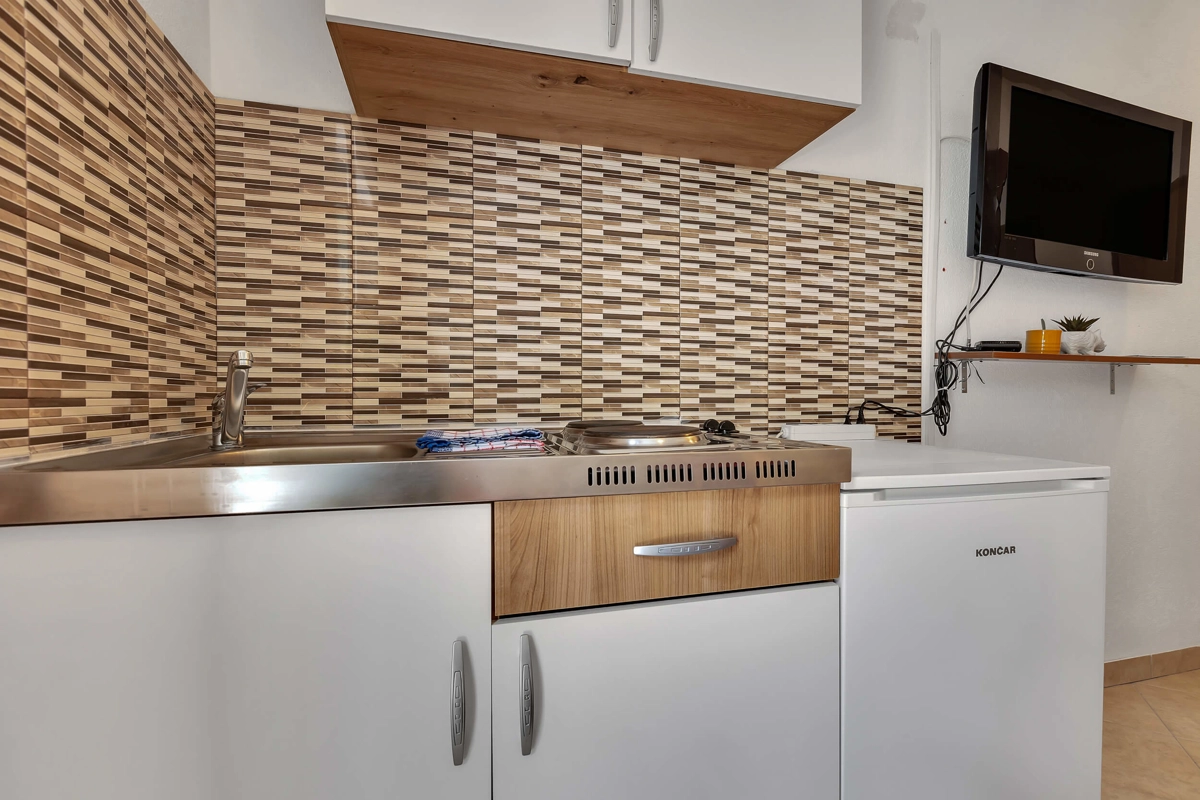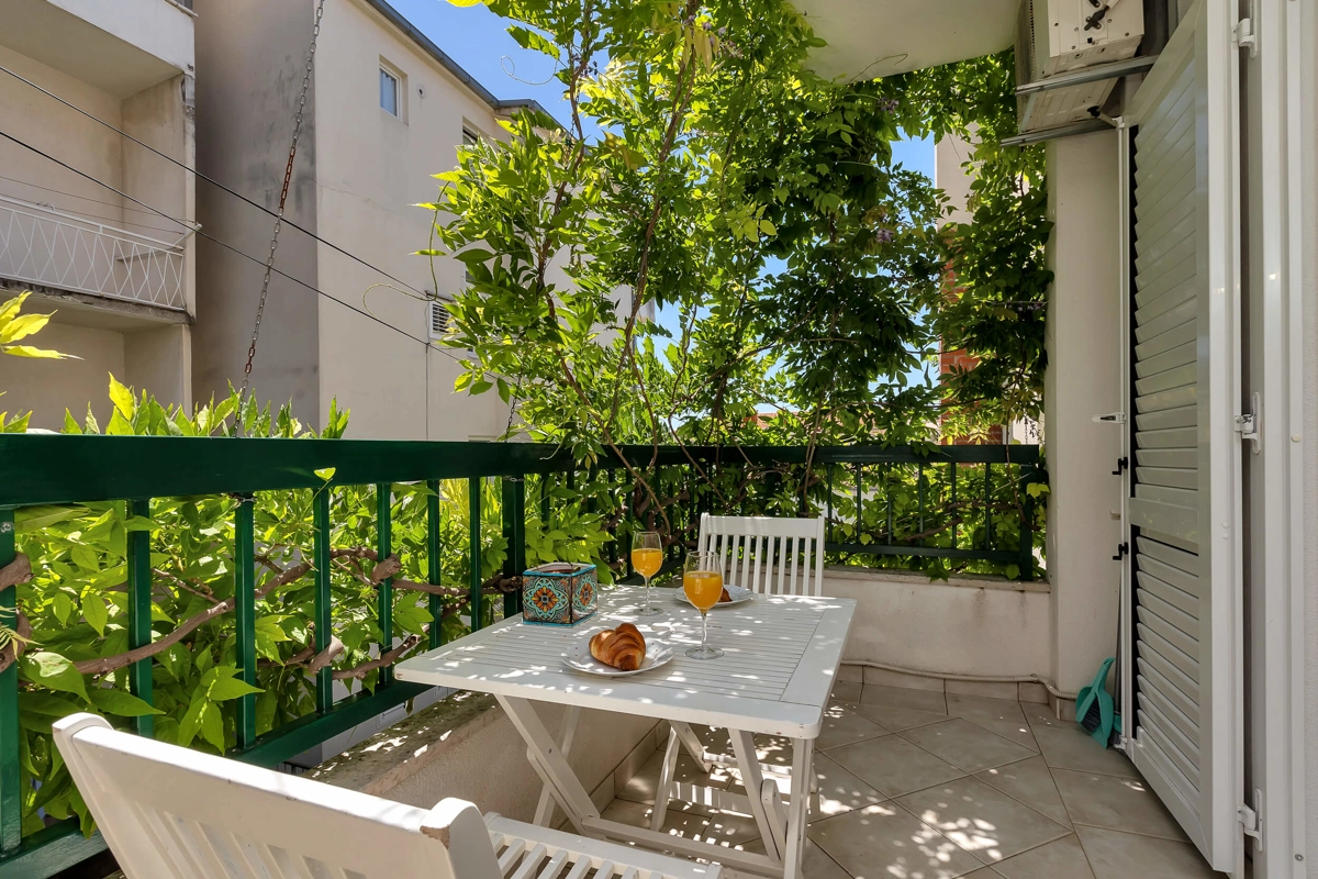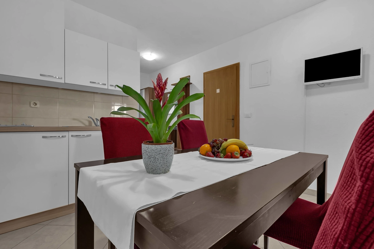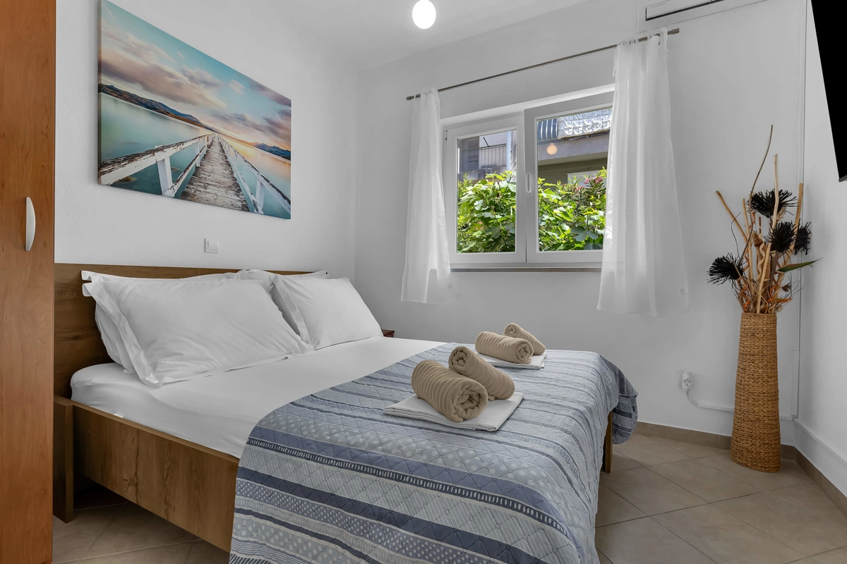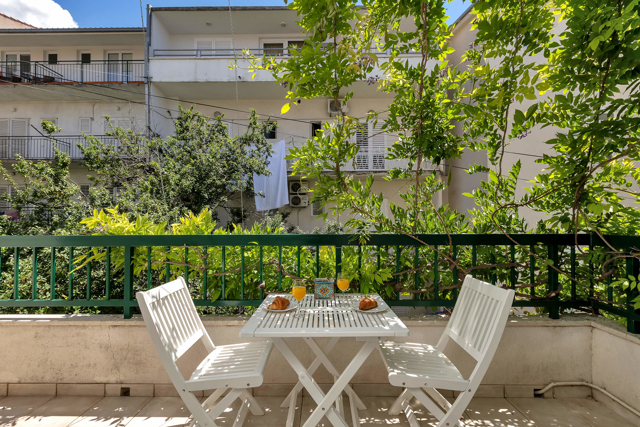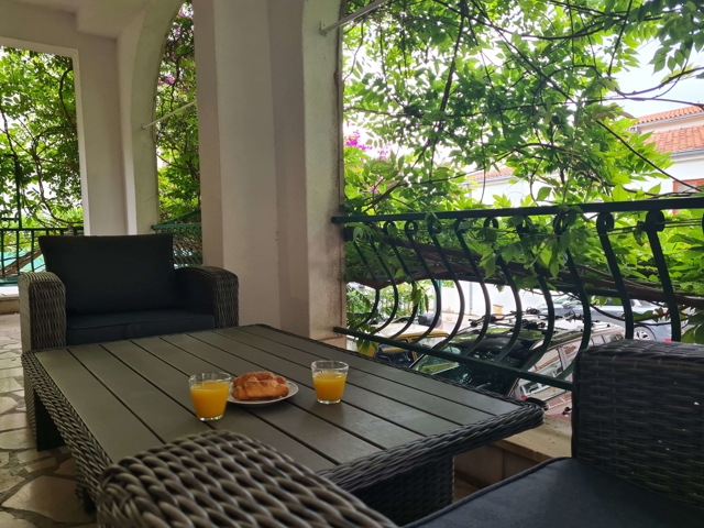 Apartment A3 is a studio apartment for 2 persons, situated on the 2nd floor. It has one queen-sized bed and a mini-kitchen with a dining area. With a terrace surrounded with greenery it is a perfect summer oasis for two. Apartment is air-conditioned, has a free parking and wi-fi. Bed linen and towels are provided in the apartment.