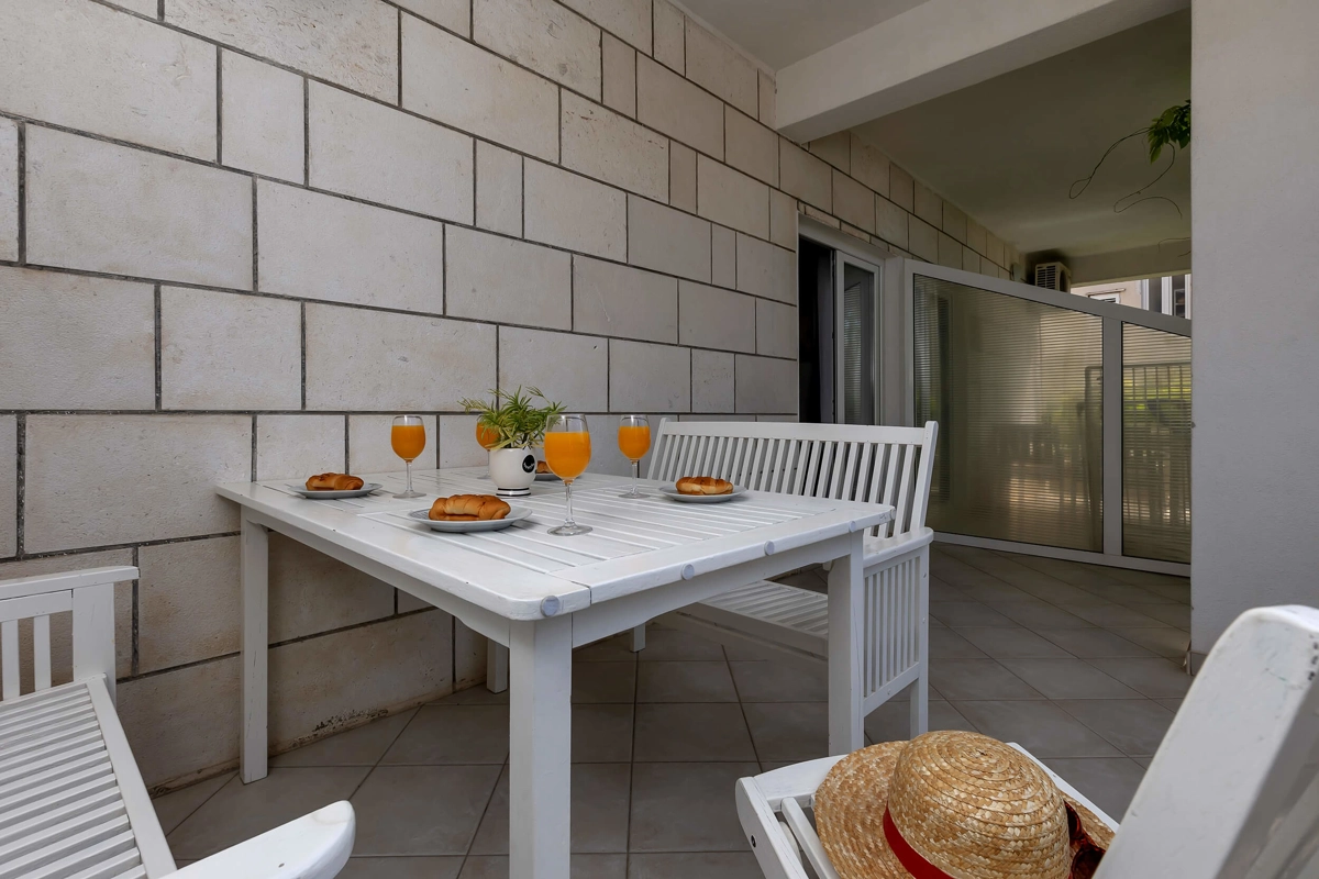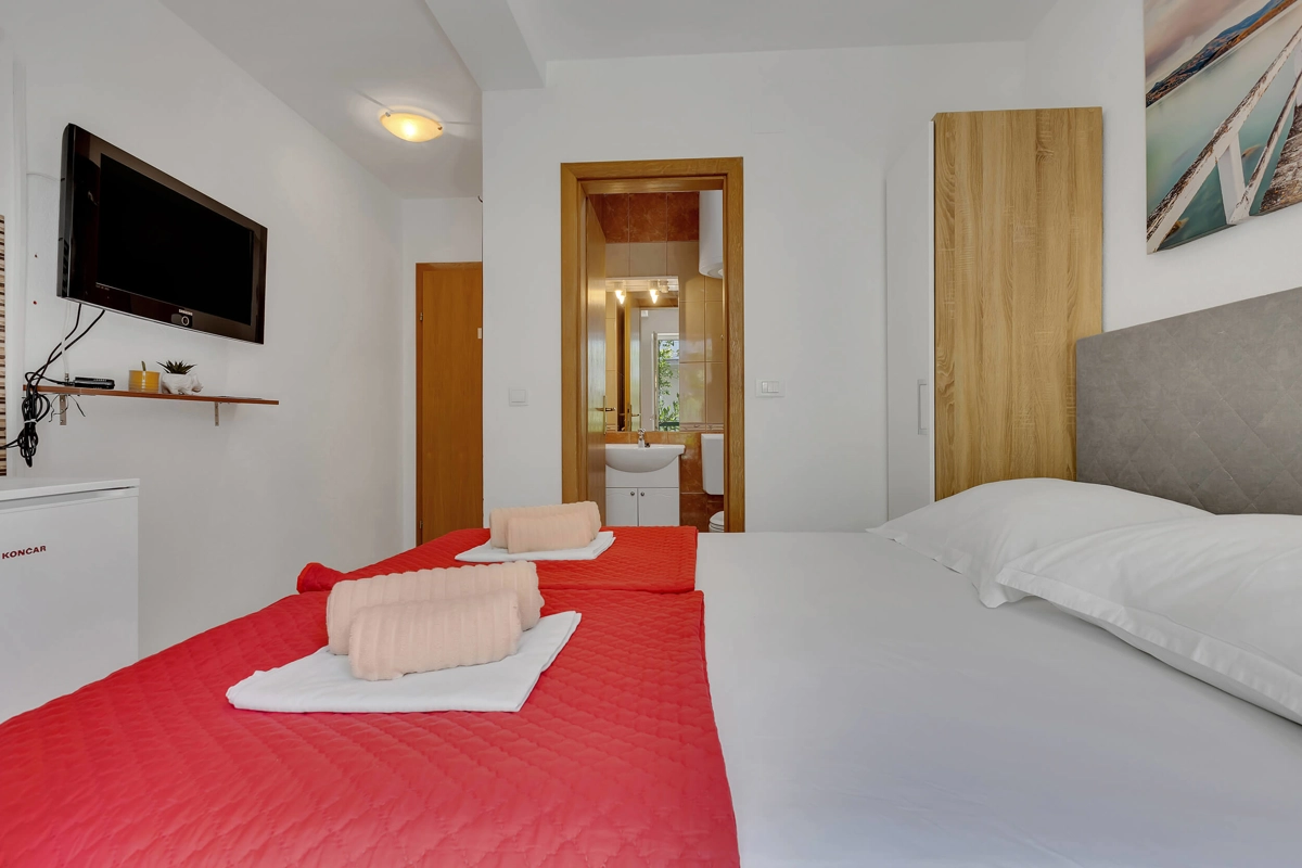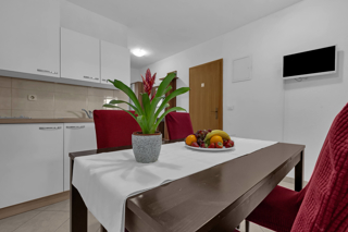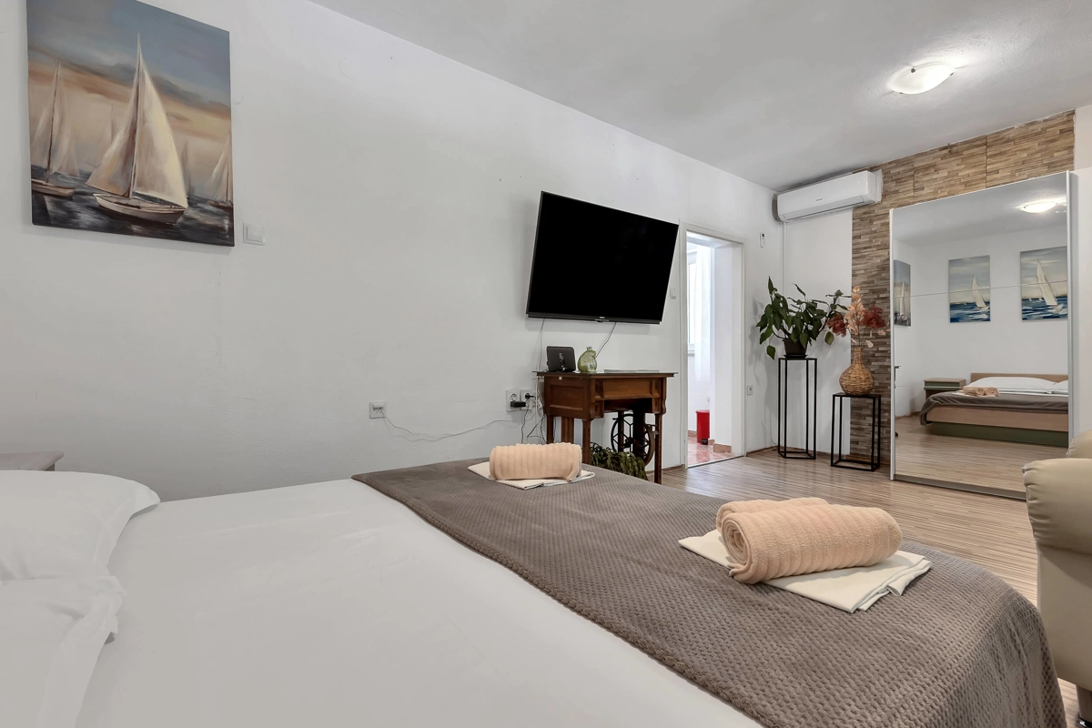 Apartment A2 is a two-bedroom apartment for 4 persons, with a flat-screen TV, and a dining area with a dining table. Each bedroom has a queen-sized bed. Apartment is air-conditioned, has a free parking and wi-fi. Bed linen and towels are provided in the apartment.
