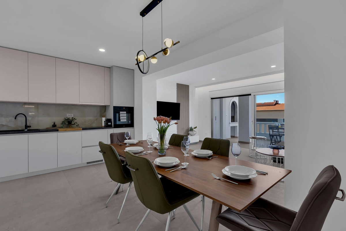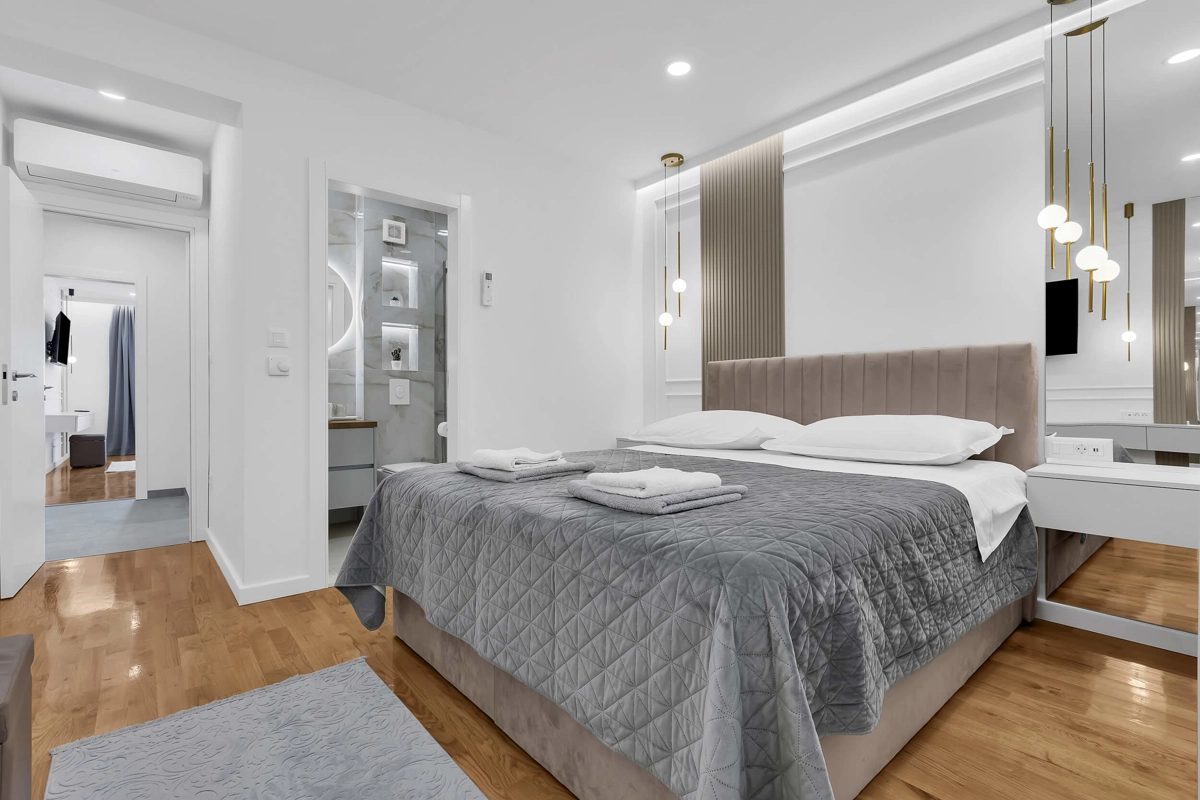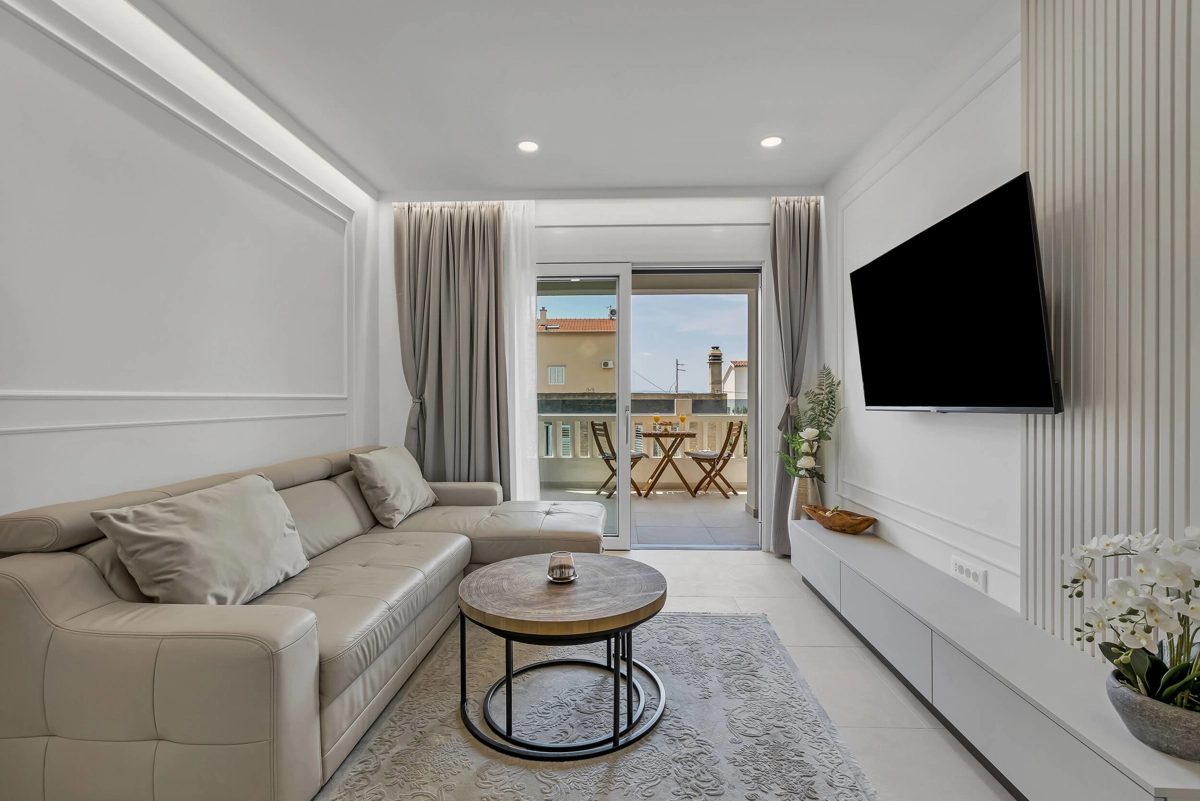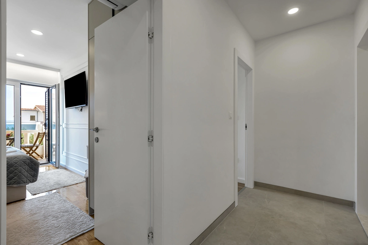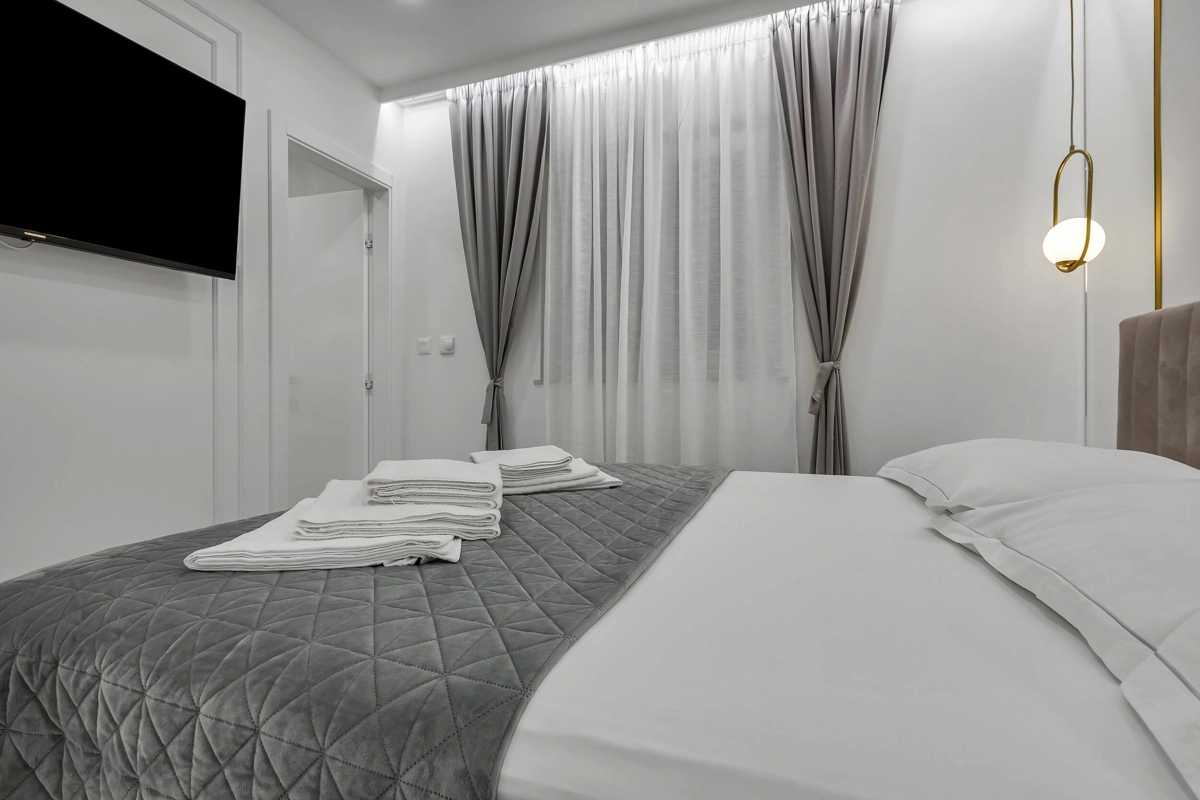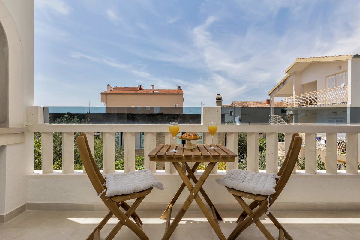 Apartment A1 has capacity for 6 persons, and is situated on the 1st floor. The apartment is air-conditioned, has 3 bedrooms, 3 bathrooms, living room with a flat-screen TV, a dining area with a dining table, fully equipped kitchen, and a terrace with a seating area for cozy relaxing evenings. Each bedroom has a queen-sized bed and its own bathroom. Apartment is air-conditioned, has a free parking and wi-fi. Bed linen and towels are provided in the apartment.