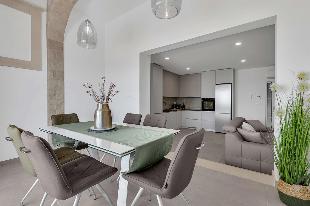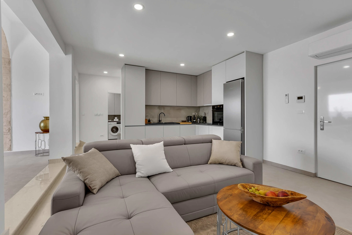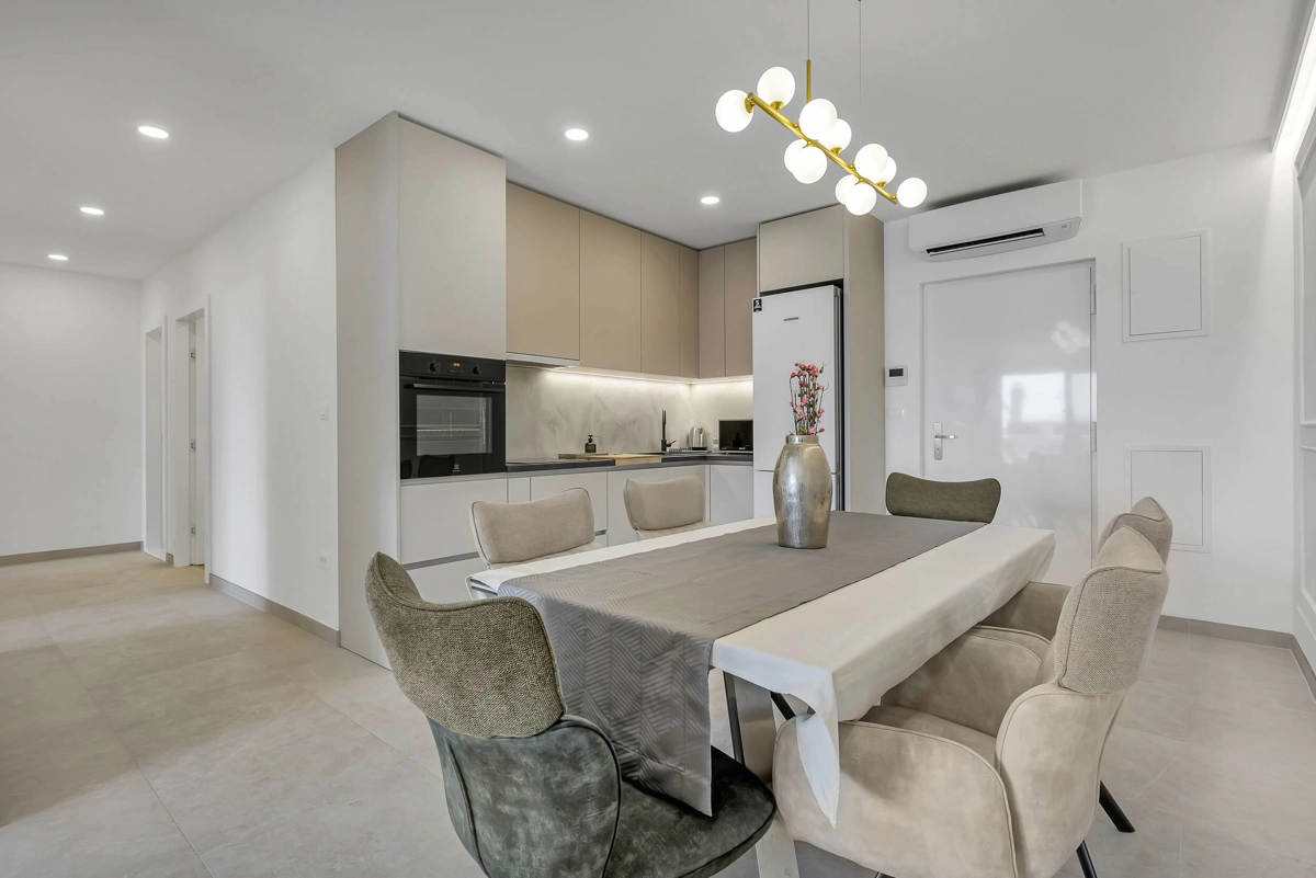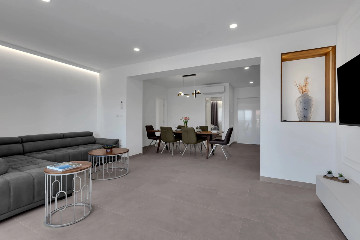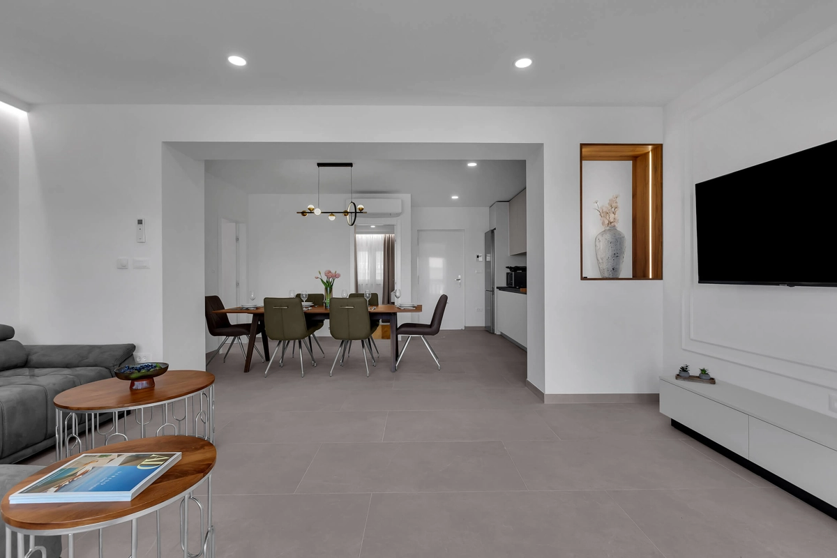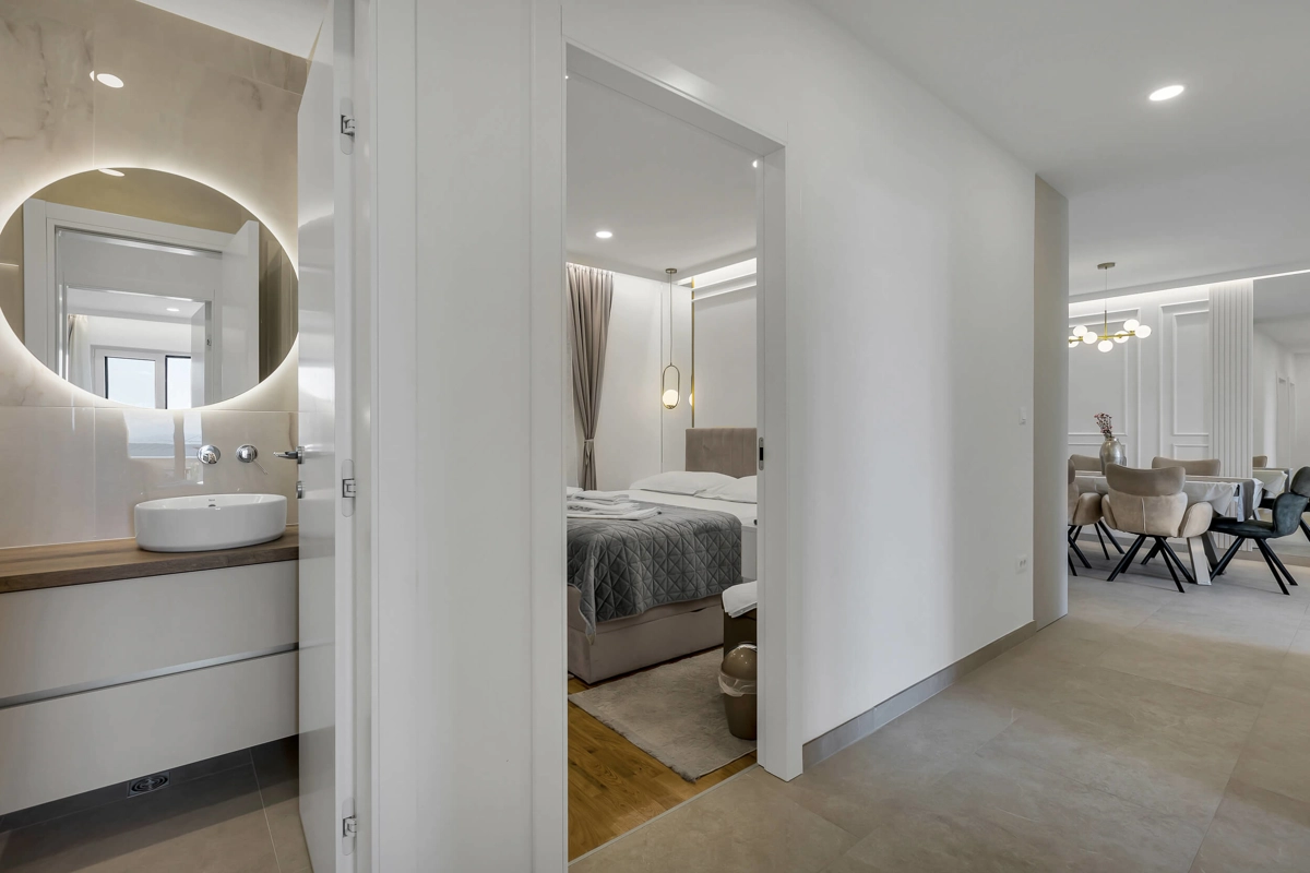 Apartment A1 has capacity for 6 persons, and is situated on the 1st floor. The apartment is air-conditioned, has 3 bedrooms, 3 bathrooms, living room with a flat-screen TV, a dining area with a dining table, fully equipped kitchen, and a terrace with a seating area for cozy relaxing evenings. Each bedroom has a queen-sized bed and its own bathroom. Apartment is air-conditioned, has a free parking and wi-fi. Bed linen and towels are provided in the apartment.