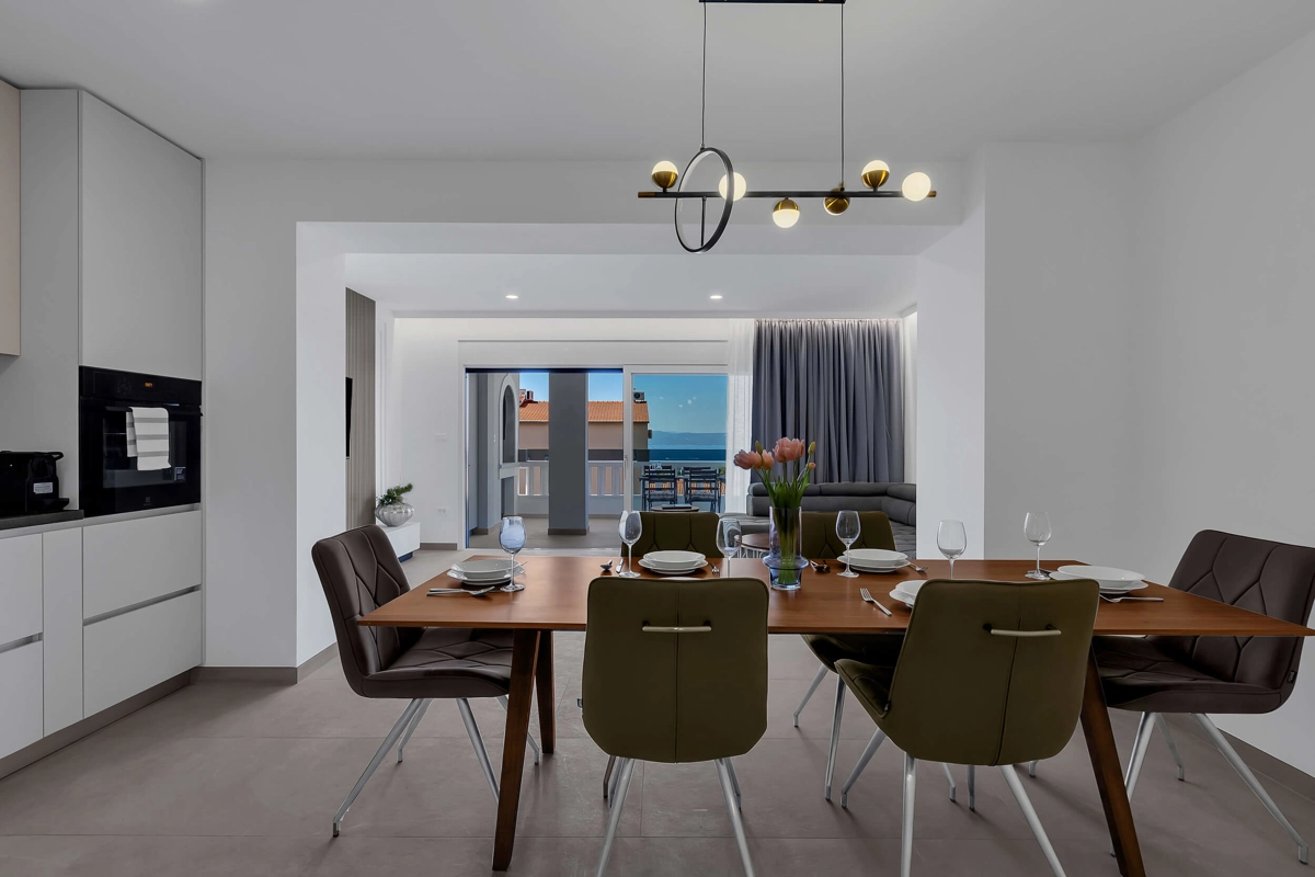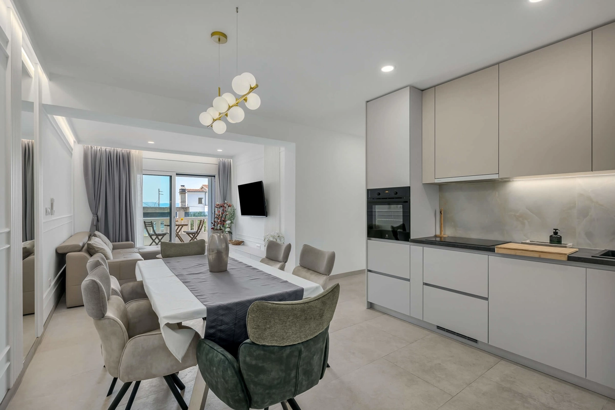 Apartment A2 has capacity for 6 persons, and is situated on the 2st floor. The apartment is air-conditioned, has 3 bedrooms, 3 bathrooms, living room with a flat-screen TV, a dining area with a dining table, fully equipped kitchen, and a terrace with a seating area for cozy relaxing evenings with an amazing view of the sea. Each bedroom has a queen-sized bed and its own bathroom. Apartment is air-conditioned, has a free parking and wi-fi. Bed linen and towels are provided in the apartment.