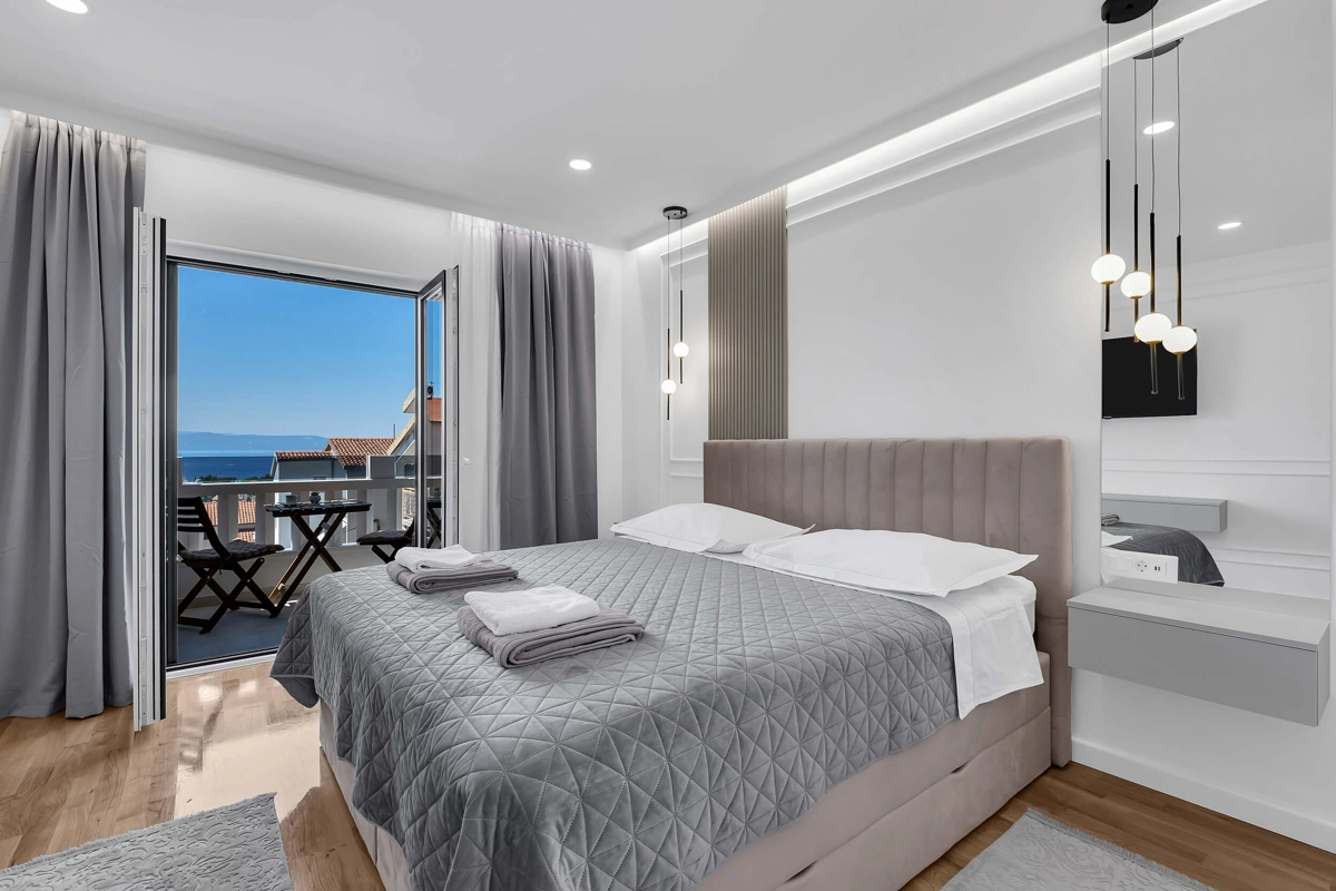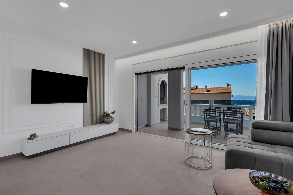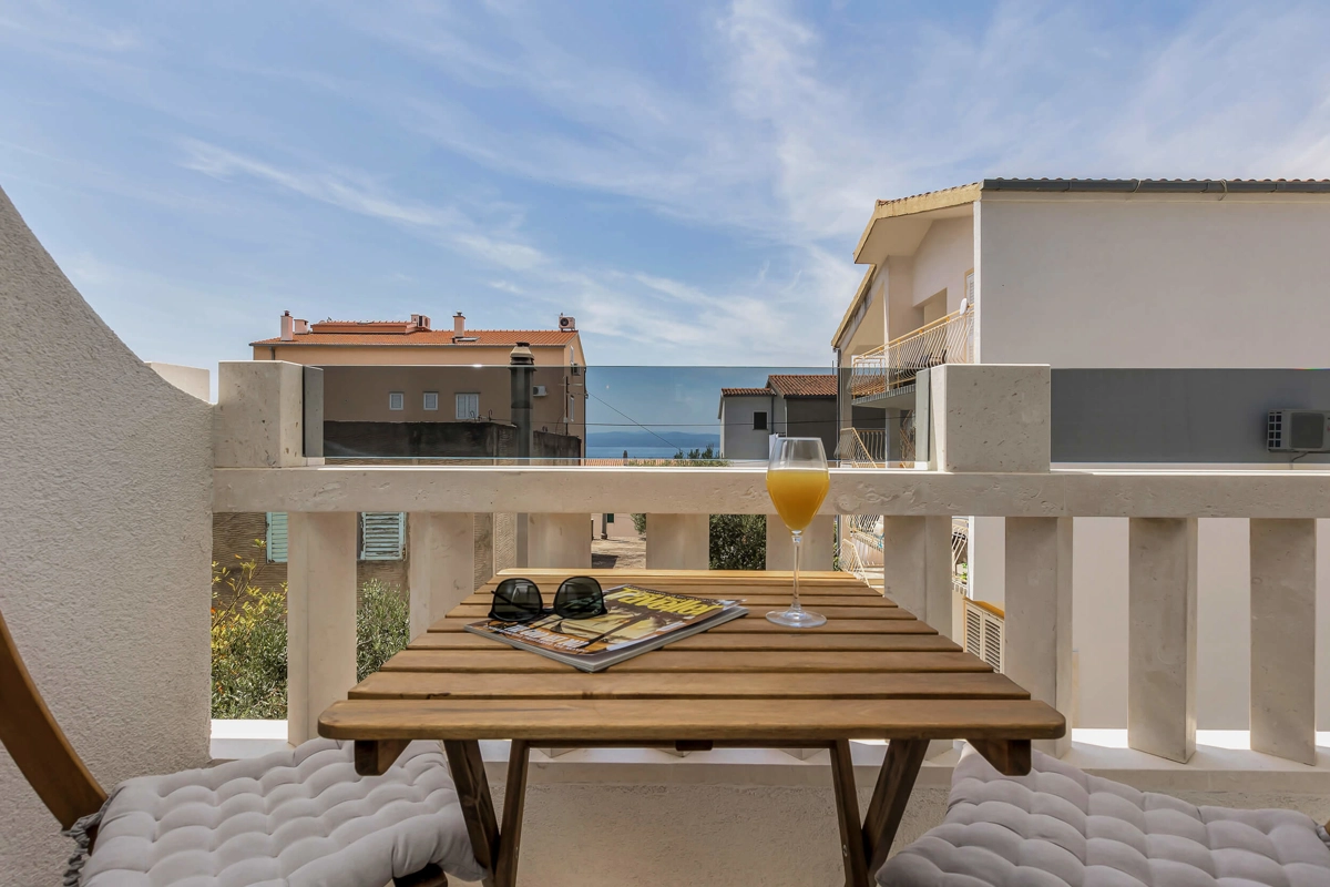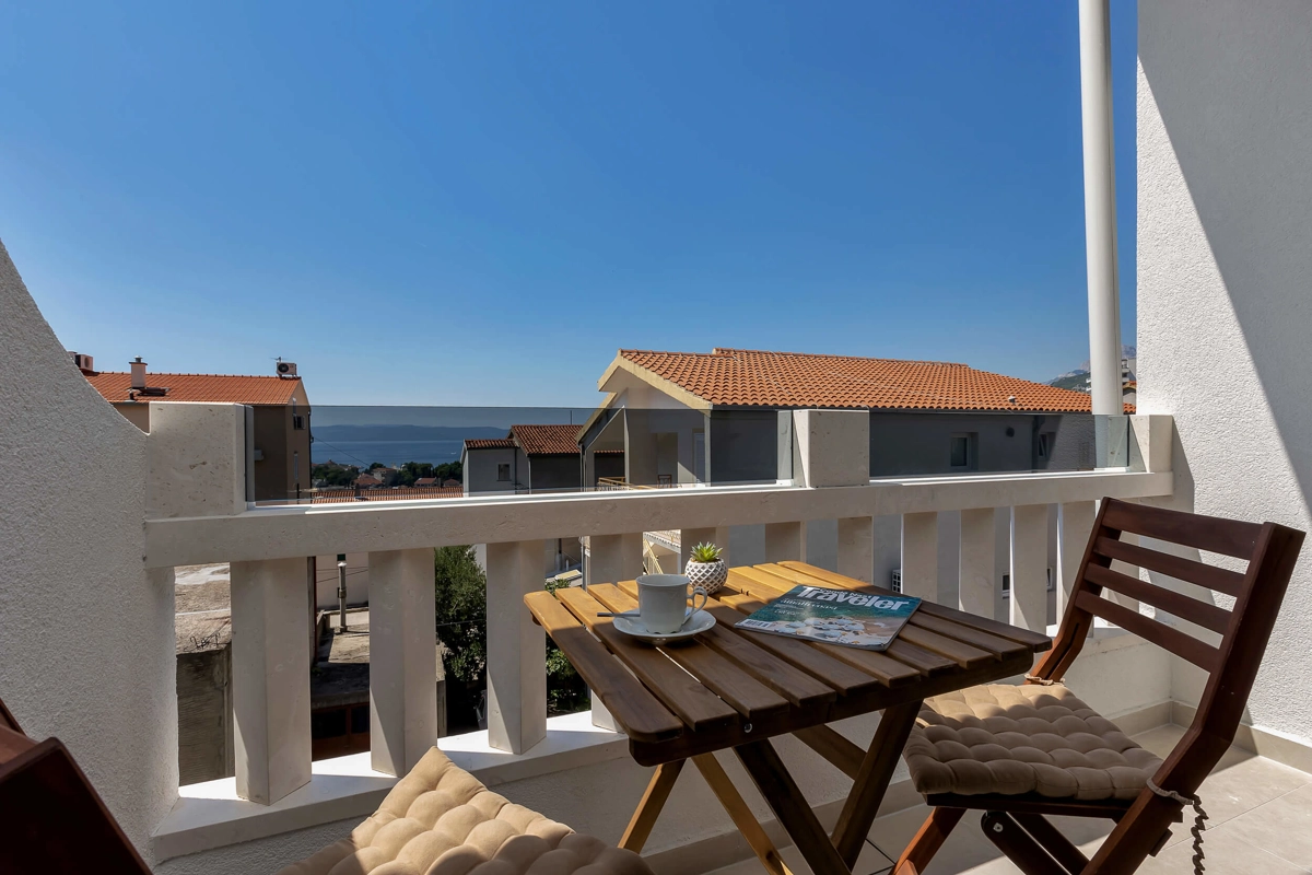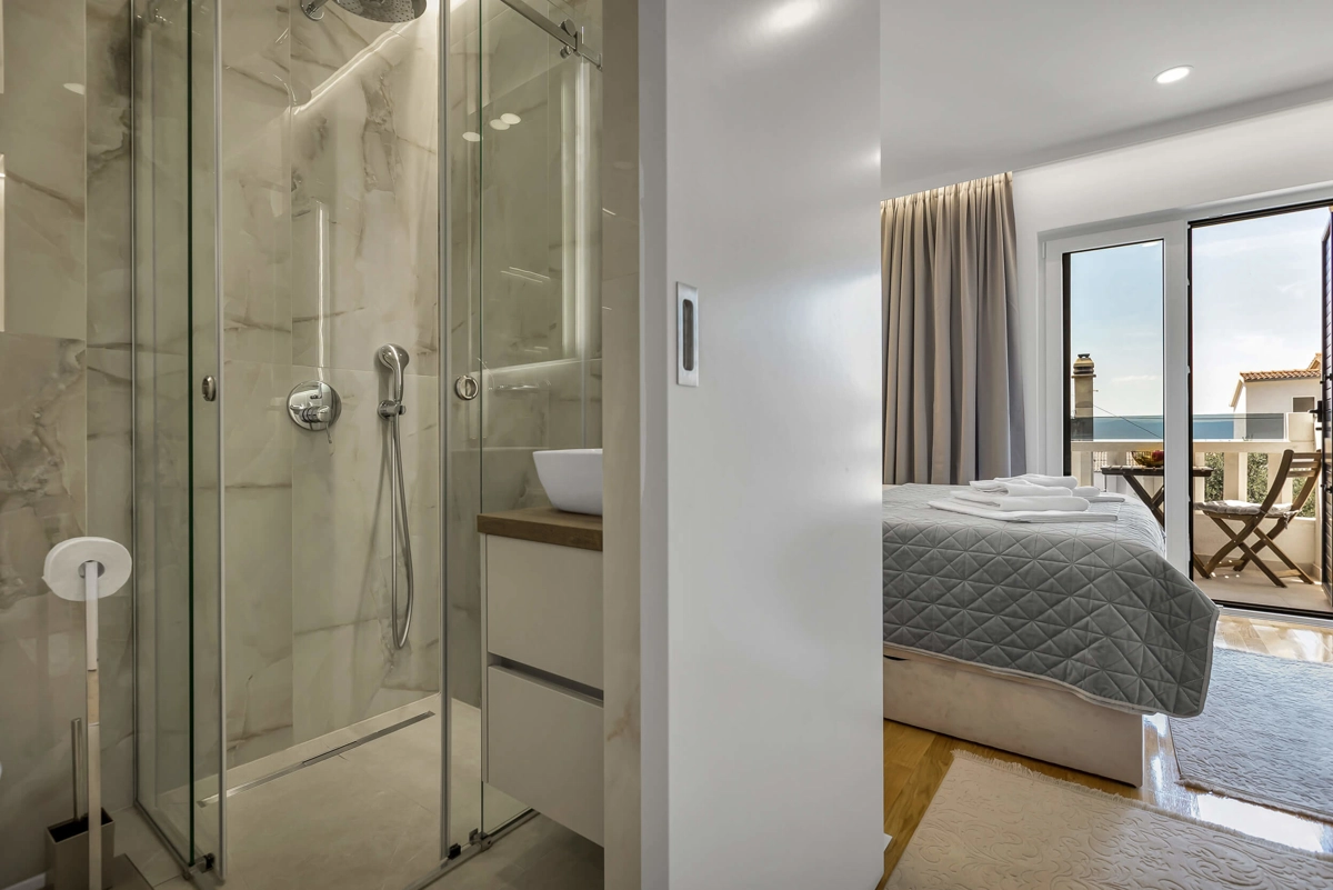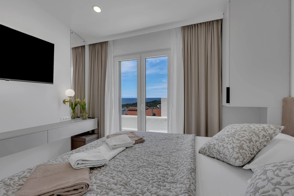Apartment A3 has capacity for 4 persons, and is situated on the top floor. The apartment is air-conditioned, has 2 bedrooms, 2 bathrooms, living room with a flat-screen TV, a dining area with a dining table, fully equipped kitchen, and a terrace with a seating area for cozy relaxing evenings with an amazing view of the sea. Each bedroom has a queen-sized bed and its own bathroom. Apartment is air-conditioned, has a free parking and wi-fi. Bed linen and towels are provided in the apartment.