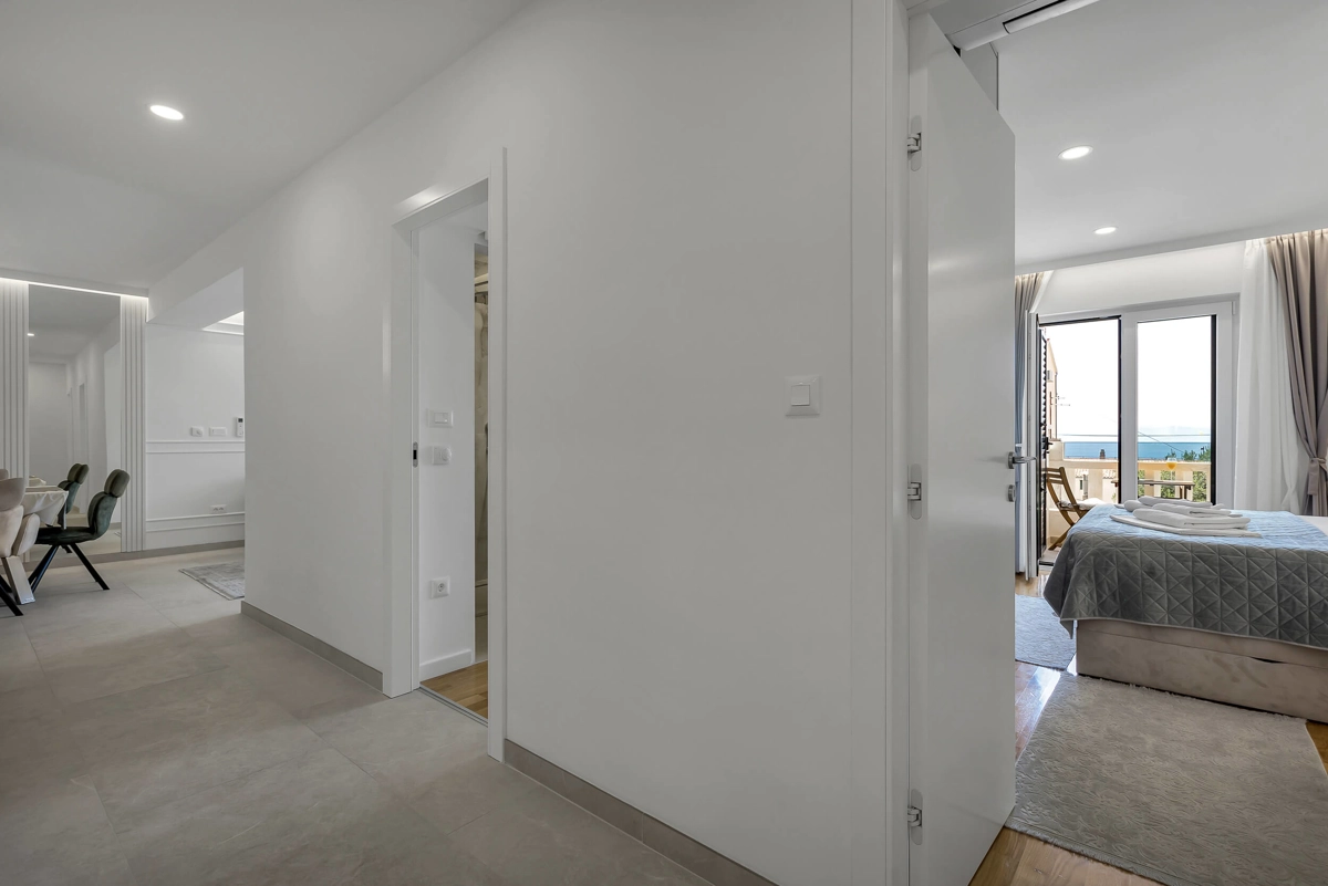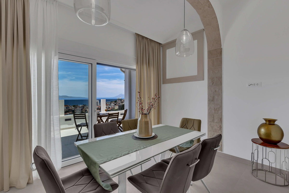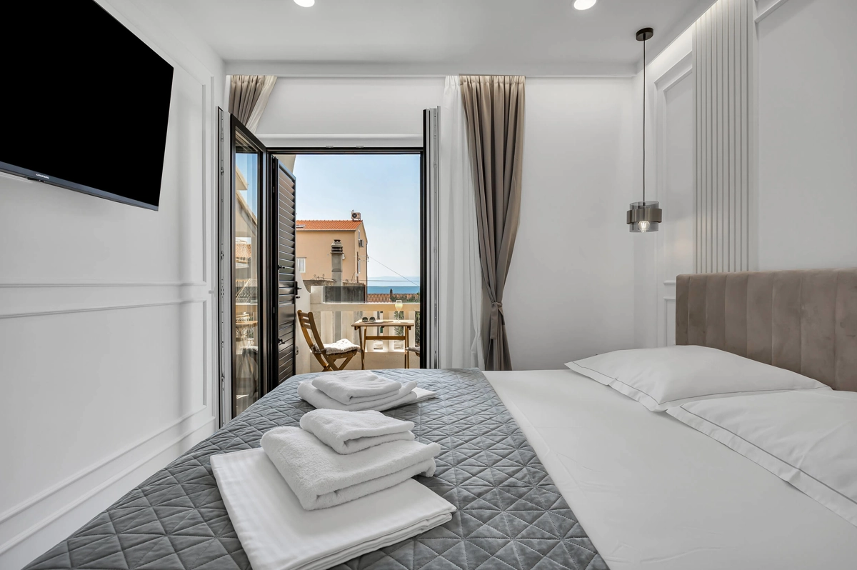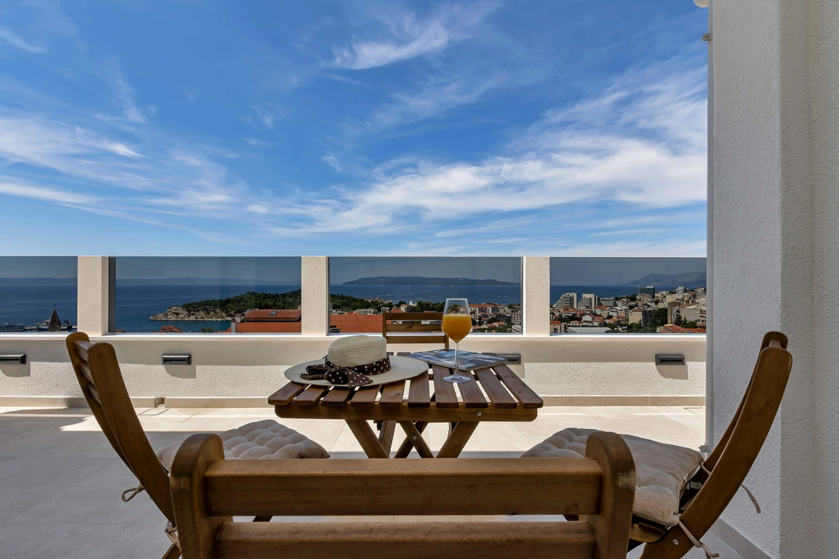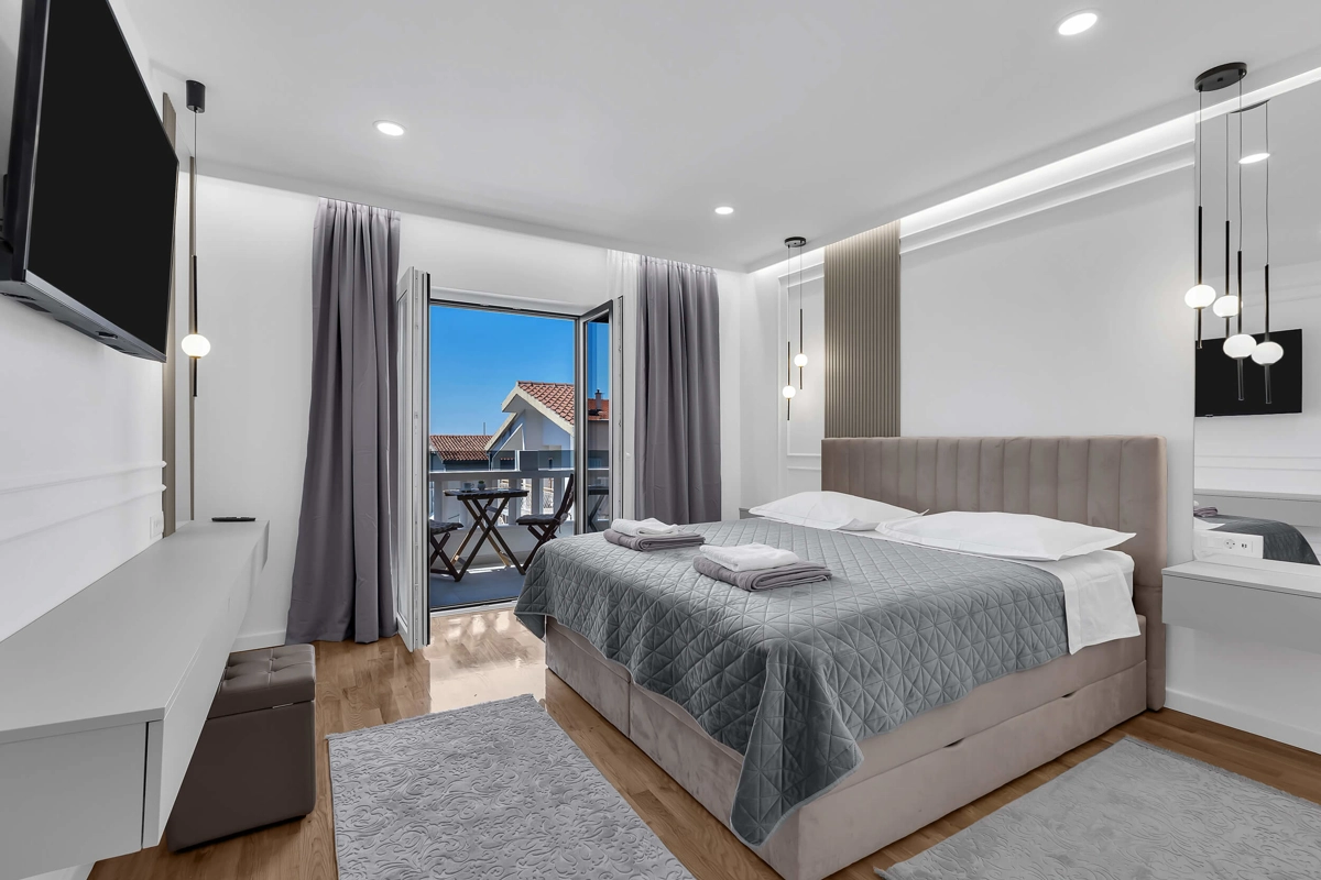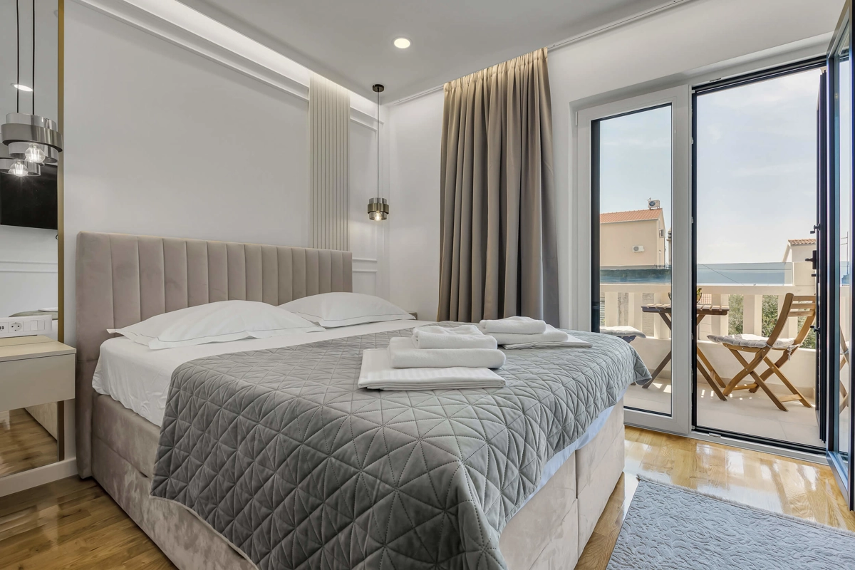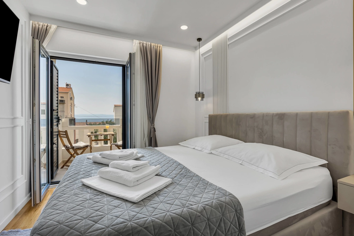 Apartment A3 has capacity for 4 persons, and is situated on the top floor. The apartment is air-conditioned, has 2 bedrooms, 2 bathrooms, living room with a flat-screen TV, a dining area with a dining table, fully equipped kitchen, and a terrace with a seating area for cozy relaxing evenings with an amazing view of the sea. Each bedroom has a queen-sized bed and its own bathroom. Apartment is air-conditioned, has a free parking and wi-fi. Bed linen and towels are provided in the apartment.