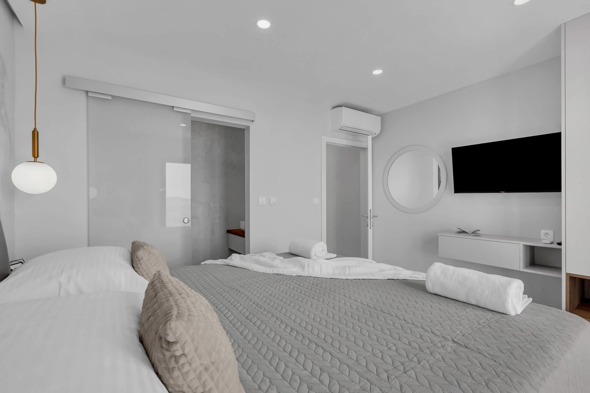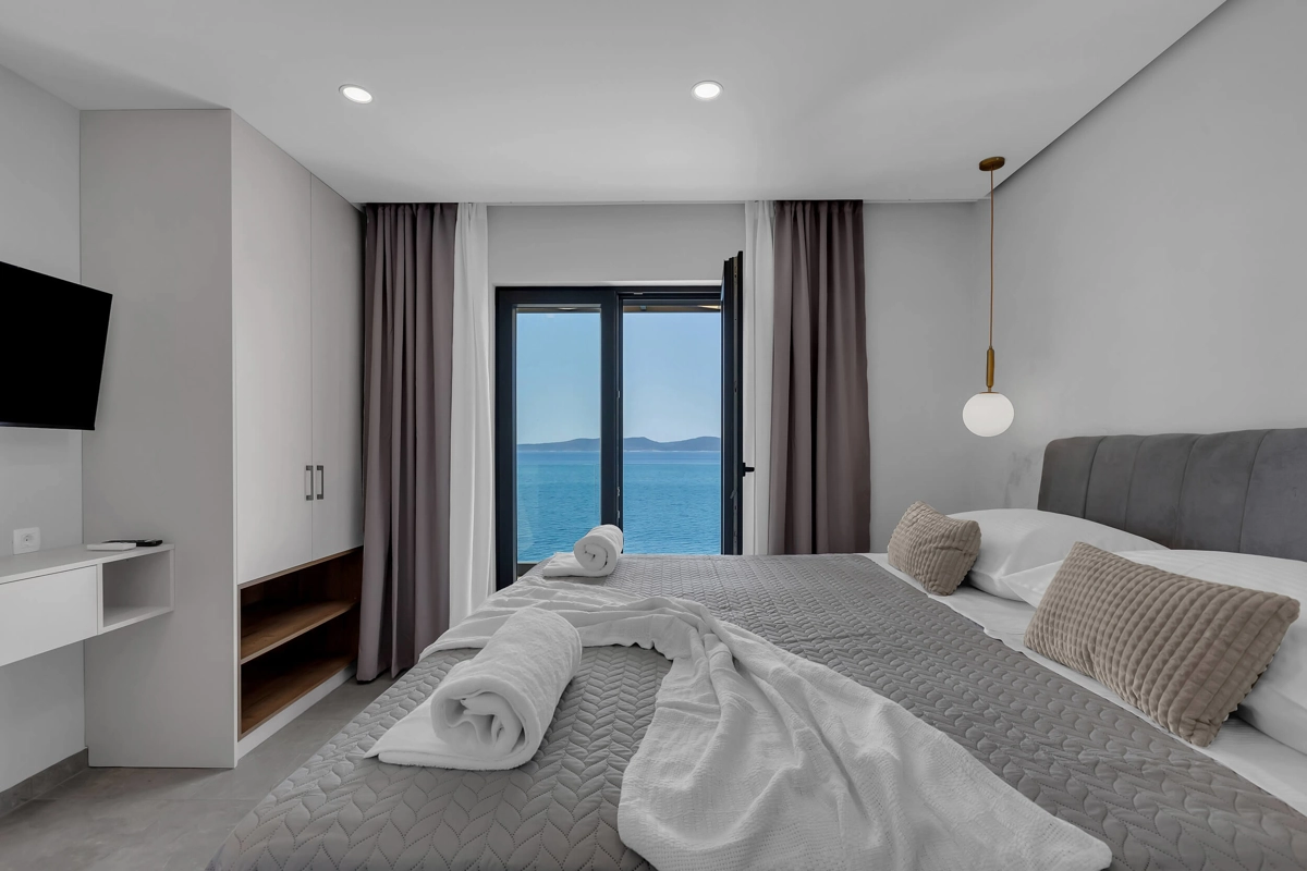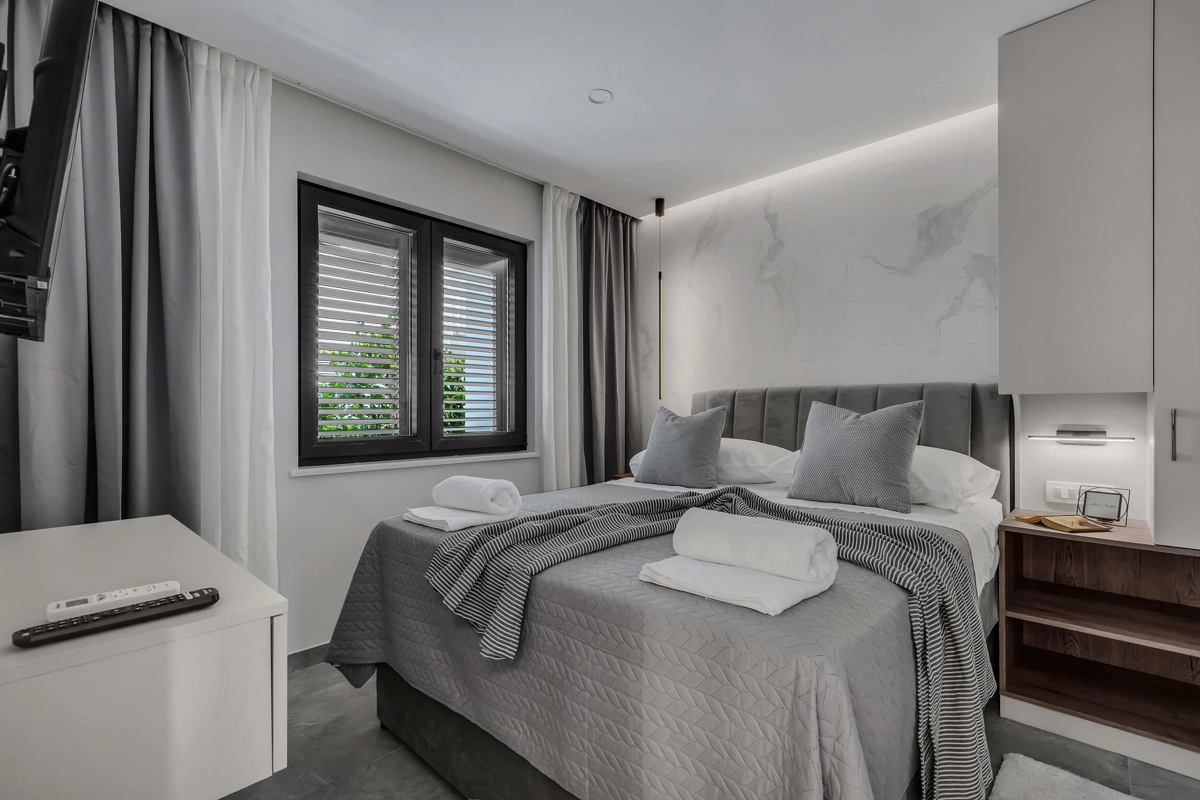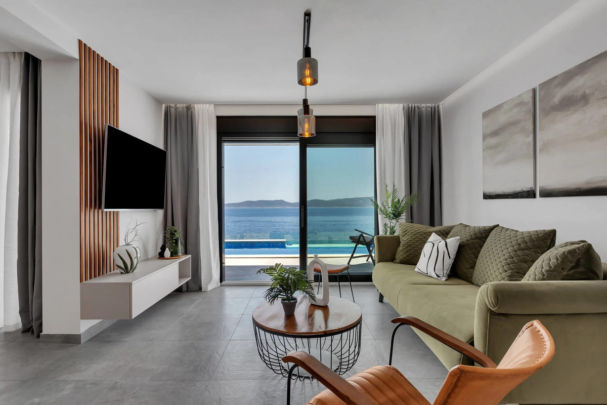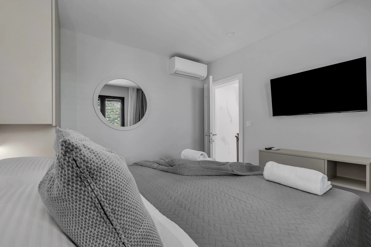 Vila Plenus in Pisak is a villa for 6 persons with a private heated pool, private parking and an amazing panoramic view. This modern villa with 3 bedrooms and 3 bathrooms is fully air-conditioned. Big, modern and fully equipped kitchen invites you to try it out to its maximum, but if you would rather enjoy the panoramic view, put a hat on and take your place on one of the lounge chairs on a stunning sun-deck. Read a book, have a glass of local wine or just slide down and enjoy your siesta time. If you came to enjoy the sea, beware, the pool with this incredible panoramic view will test you to stay in and relax watching the sun go down. Even if the beach is only 20 meters away!